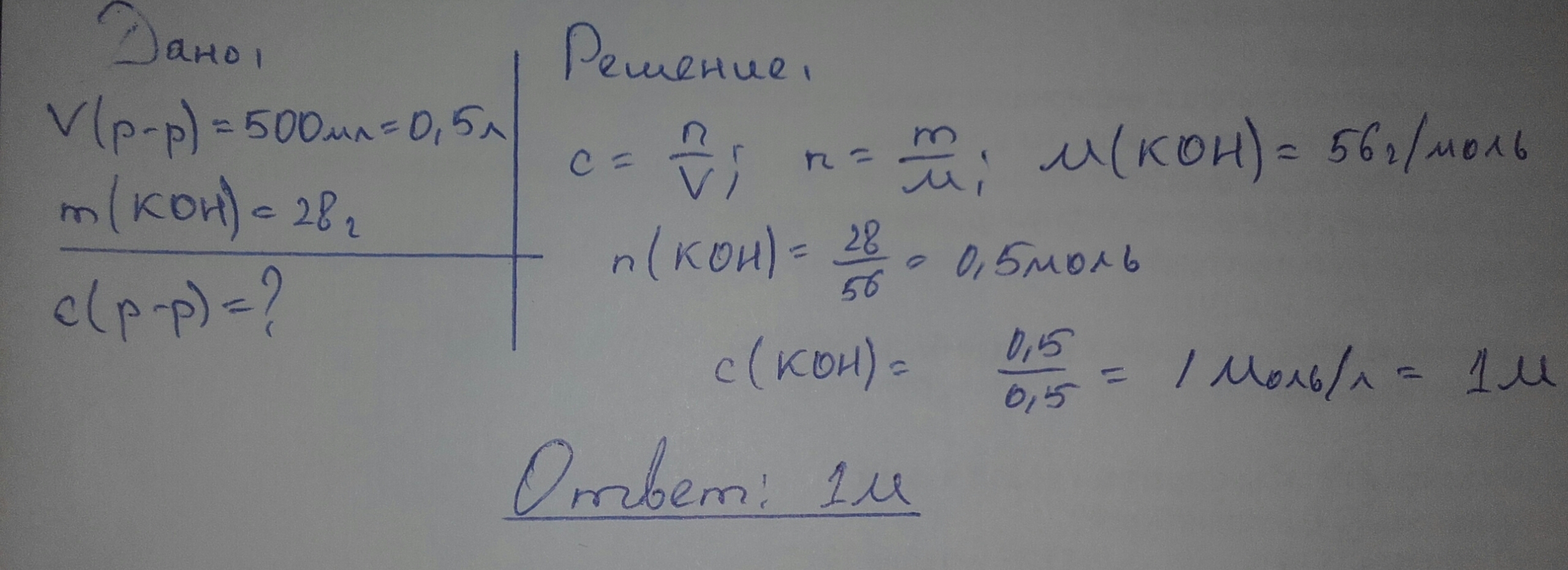 Решение на фото. Молярная концентрация раствора равна отношению количества растворённого вещества к объёму раствора (в литрах)