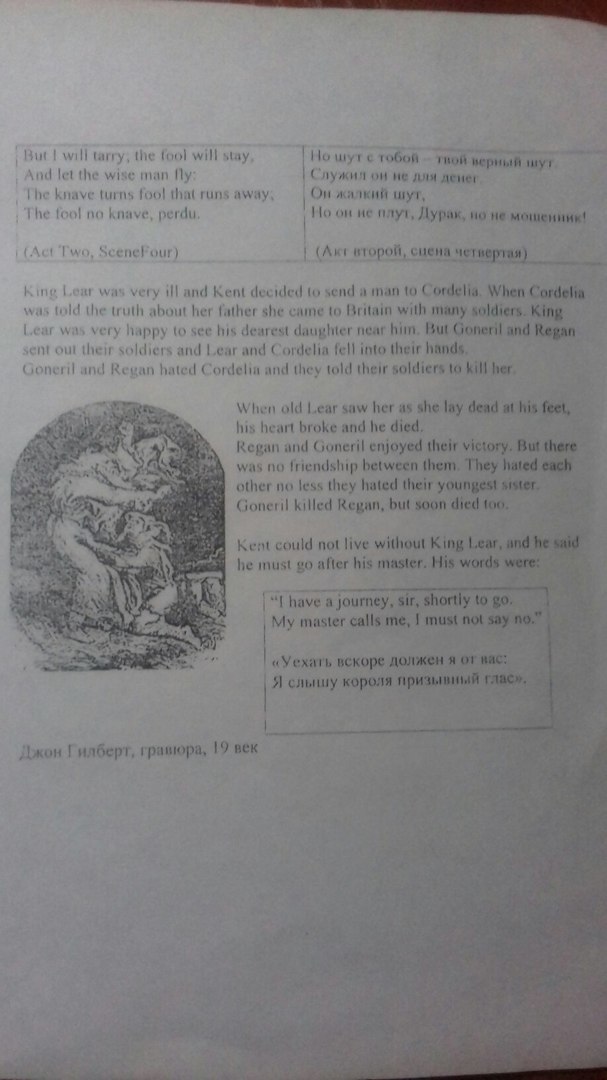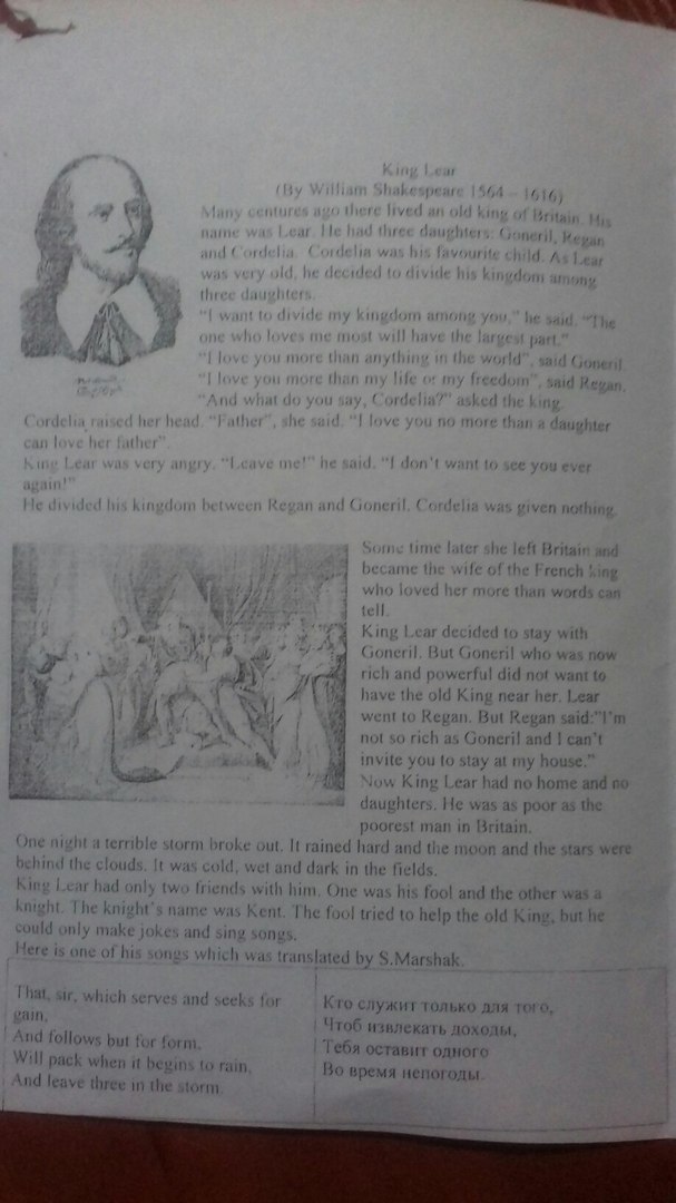 Много веков назад жил старый король Британии. Его звали Лир. Были у него три дочери Гонерил, Реган и Корделия. Корделия была его любимым ребёнком. Лир был очень стар, он решил разделить его Королевство между тремя дочерьми.