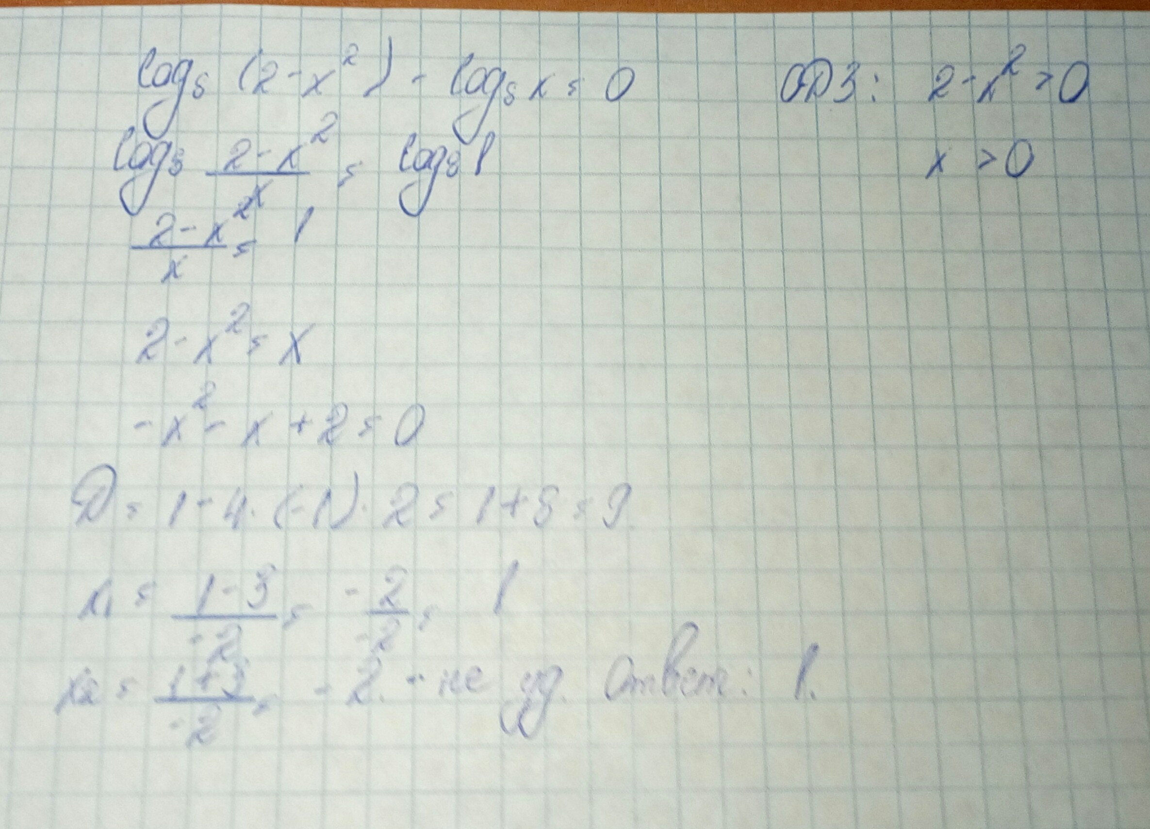 log8 (2-x²) - log8 x =0 (2-x²>0; x>0)