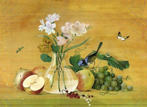 Картина Федора Петровича Толстого "Цветы, фрукты, птица" поражает своей простотой и, одновременно, легкостью и живостью. Название картины отражает ее суть, на холсте изображены фрукты, ваза с цветами и маленькая птичка.