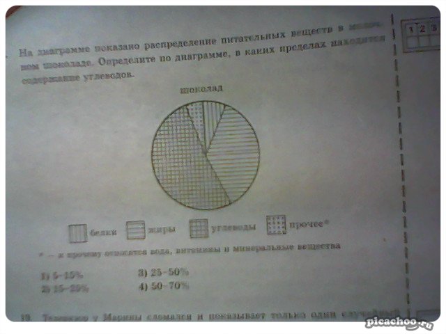На диаграмме показано распределение питательных веществ в молочном шоколаде.Определите по диаграмме , в каких пределах находится содержание углеводов.