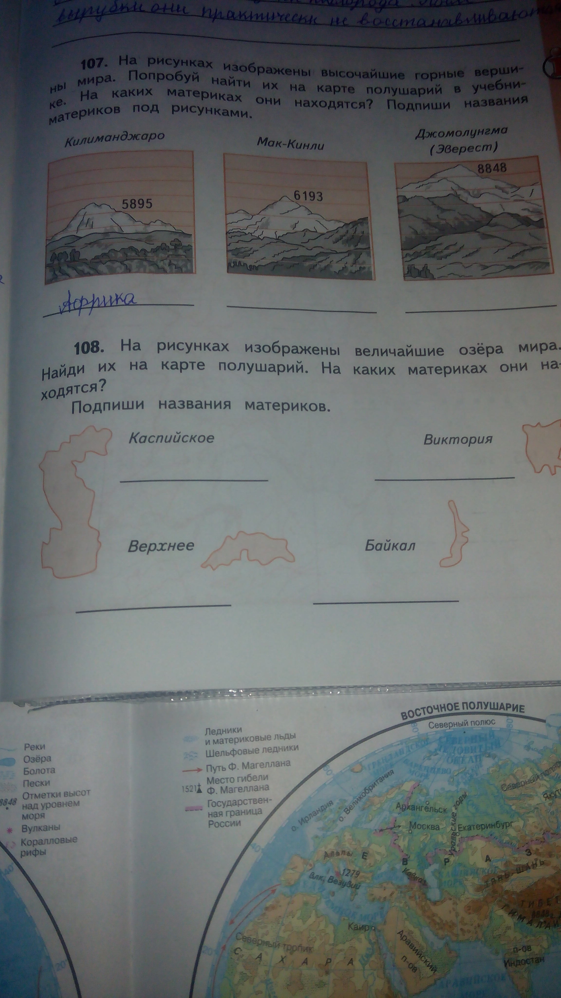 Каспийское озеро в Евразии, Верхнее озеро в Северной Америке, озеро Виктория в Восточной Африке, озеро Байкал в Евразии.