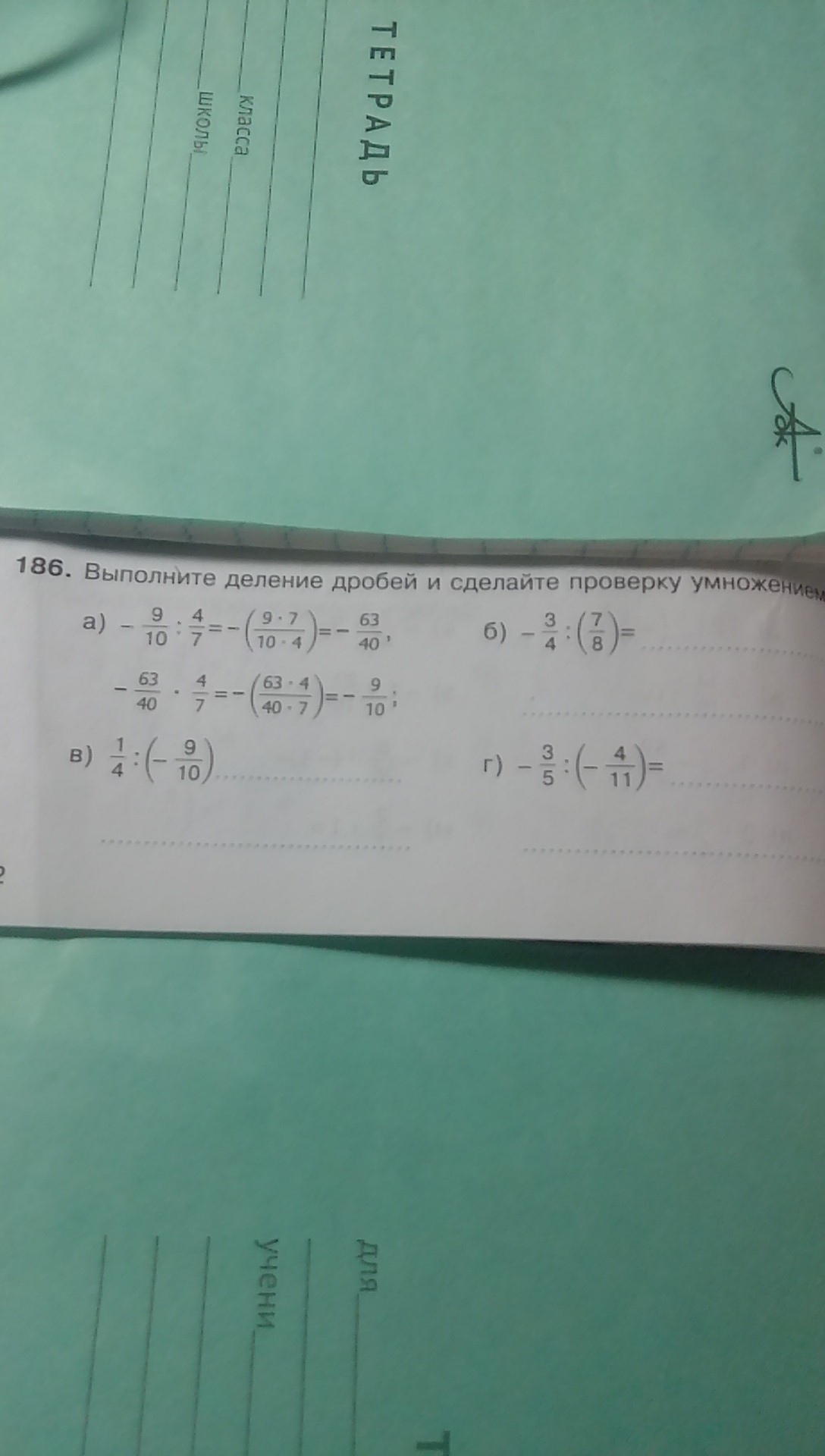 б) -3/4:(7/8)=-3/4*8/7=-6/7 в) 1/4:(-9/10)=1/4*(-10/9)=-5/18 г) -3/5:(-4/11)=-3/5*(-11/4)=33/20 а)-9/10:4/7= -9/10 * 7/4= -63/40