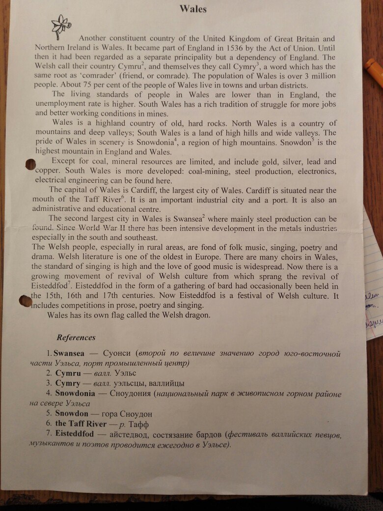 Другой составляющей страны (ложь! Соединенное Королевство Великобритании и Северной Ирландии Уэльс вошел в состав Англии в 1536 году акта об унии, а до тех пор это было рассматривать как отдельное княжество, но ла Аль-зависимость от Англии. Валлийцы называют свою страну тИЦ н и сами они называют Cymryy ла-слово, которое имеет тот же корень, товарищ? (друга или товарища), население Уэльса составляет более 3 миллионов человек. Около 75 процентов людей в Уэльсе проживает в городах и городских округов, уровень жизни людей! в Уэльсе ниже, чем в Англии, уровень безработицы выше Южного Уэльса ла богатыми традициями борьбы за дополнительных рабочих мест и улучшения условий труда в шахтах Уэльса хайленд стране я старый, твердых пород. Северный Уэльс-это страна гор и глубоких долин Южного Уэльса #земля высоких холмов и широких долин, гордость Уэльса в продавец Сноудония региона или высокие горы Сноудон* это самая высокая гора в Англии и Уэльсе, за исключением угля, минеральных ресурсов ограничены, и включают в себя золото, серебро, свинец и медь, Южный Уэльс более развиты: добыча угля. производство стали, электроники, электротехники можно найти здесь! Столица Уэльса (Кардифф, крупнейший город (Уэльса. Карты расположен возле устья реки Тафф? это важный промышленный город! и порт. Это также административный и образовательный центр. Второй по величине город Уэльса в Суонси? Где в основном производства стали может быть после Второй Мировой Войны Е! т! ** была #л (уровень (нефтяники! в металлургической промышленности, особенно на юге и юго-востоке Уэльса людей, особенно в сельской местности, любят народную музыку, пение, поэзия и драма. Валлийская литература является одним из старейших в веревку, есть много хоров в Уэльсе, уровень пение и любовь к хорошей #музыки широко распространена. Сейчас ширится движение возрождения культуры Уэльса, из которой выскочили возрождение Fisteddfod фестивале в виде сбора бард периодически проводятся в (ш, 16 и 17 веков, теперь числится (TOD-это фестиваль культуры Уэльса. Она включает в себя соревнования в прозе, поэзии и пения Уэльс имеет свой собственный флаг назвал Валлийского дракона,