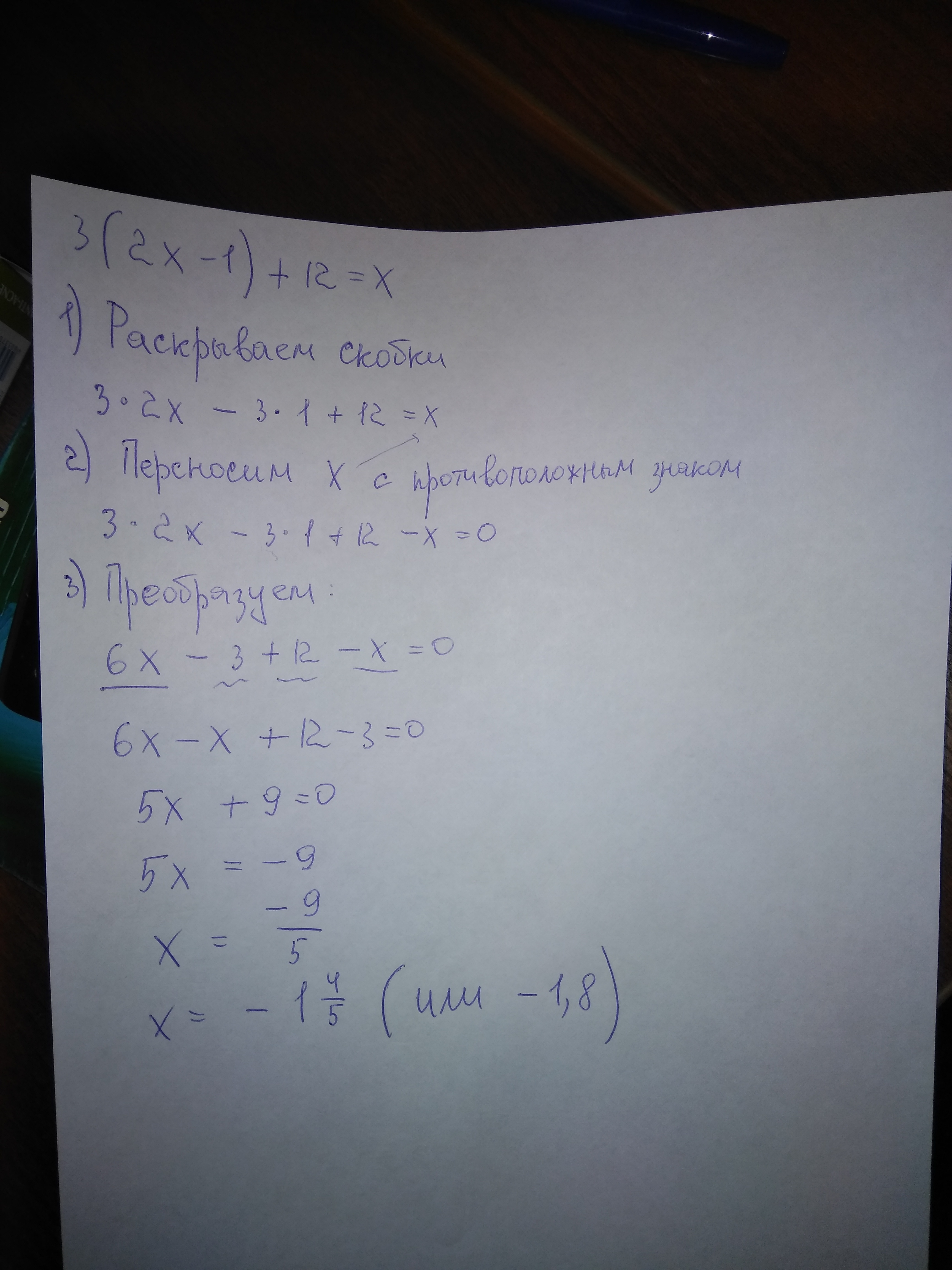 3(2x - 1) + 12 = x