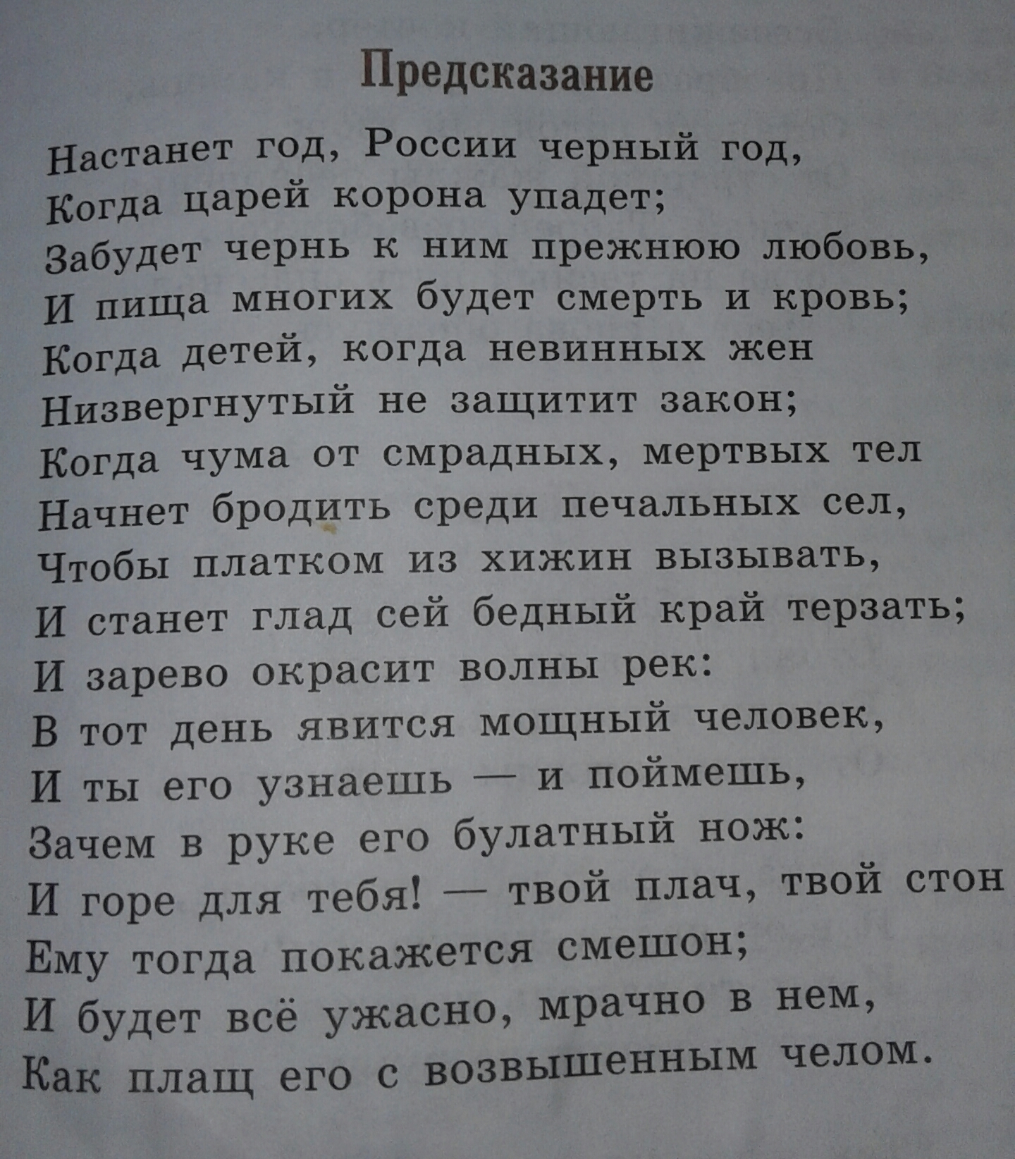 С первых строчек стихотворения «Предсказание» становится ясно, что речь в нем идет об Октябрьской революции, до которой – без малого век. Тем не менее, Лермонтов с уверенностью утверждает: «Настанет год, России черный год, когда царей корона упадет». Поддерживая в душе идеи декабристов, юный поэт, тем не менее, утверждает, что для России год революции будет черным. И далее развивает свою мысль, что «пища многих будет смерть и кровь». Эти строки рисуют в воображении картину всеобщего разрушения и хаоса, «когда детей, когда невинных жен низвергнутый не защитит закон». Если проводить параллель с 1917 годом, то становится очевидным – Лермонтов каким-то сверхъестественным образом смог не только увидеть будущее России, но и максимально точно передать его в своем стихотворении. Более того, в его «Пророчестве» содержатся шокирующая своим откровением фраза о том, что «чума от смрадных, мертвых тел начнет бродить среди печальных сел».