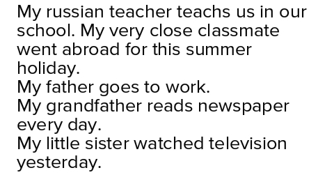 My russian teacher teachs us in our school. My very close classmate went abroad for this summer holiday.
