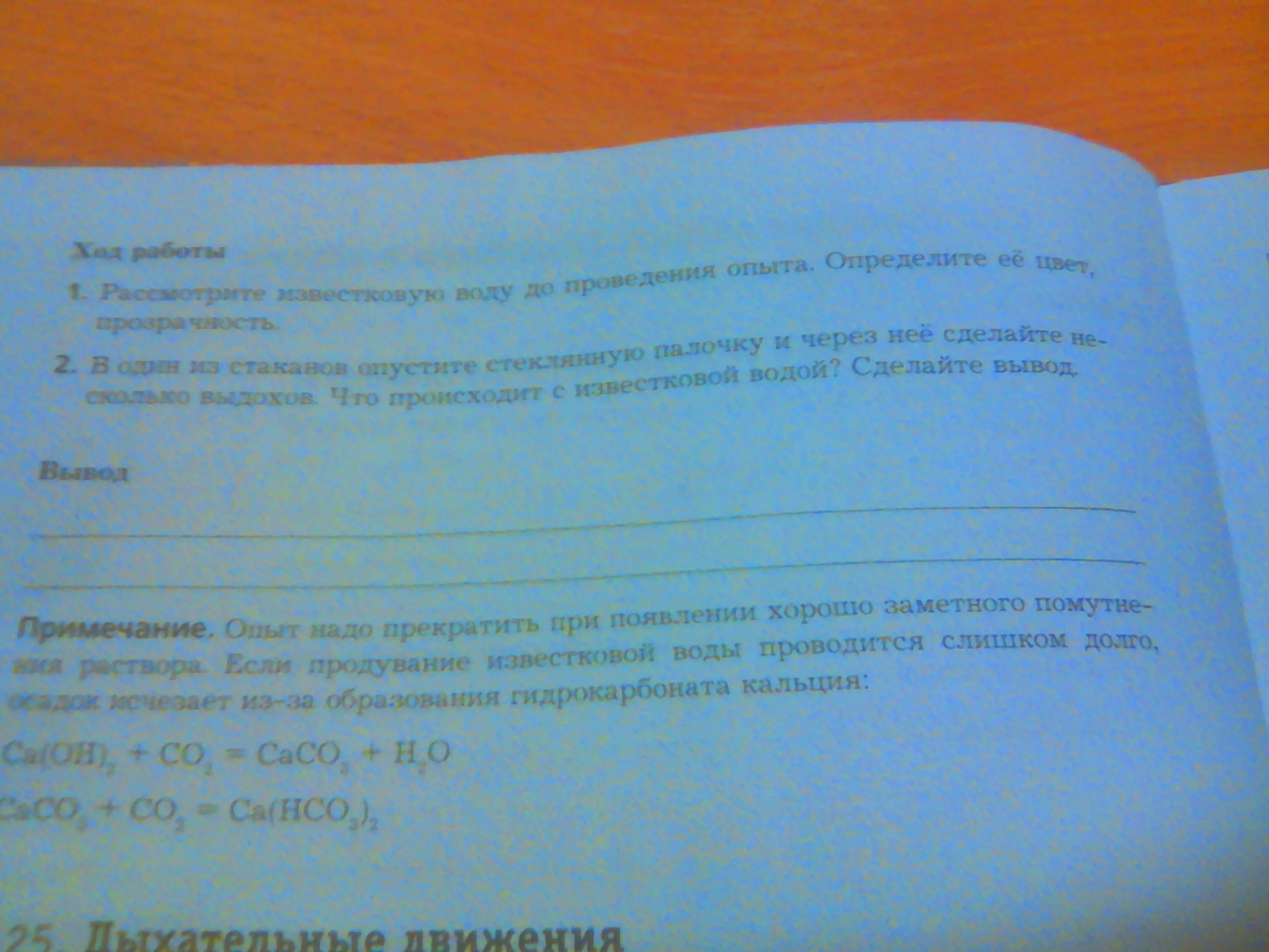 В один из стаканов опустите стеклянную трубочку и через нее сделайте несколько выдохов. Что просиходит с известковой водой? Сделайте вывод из опыта.