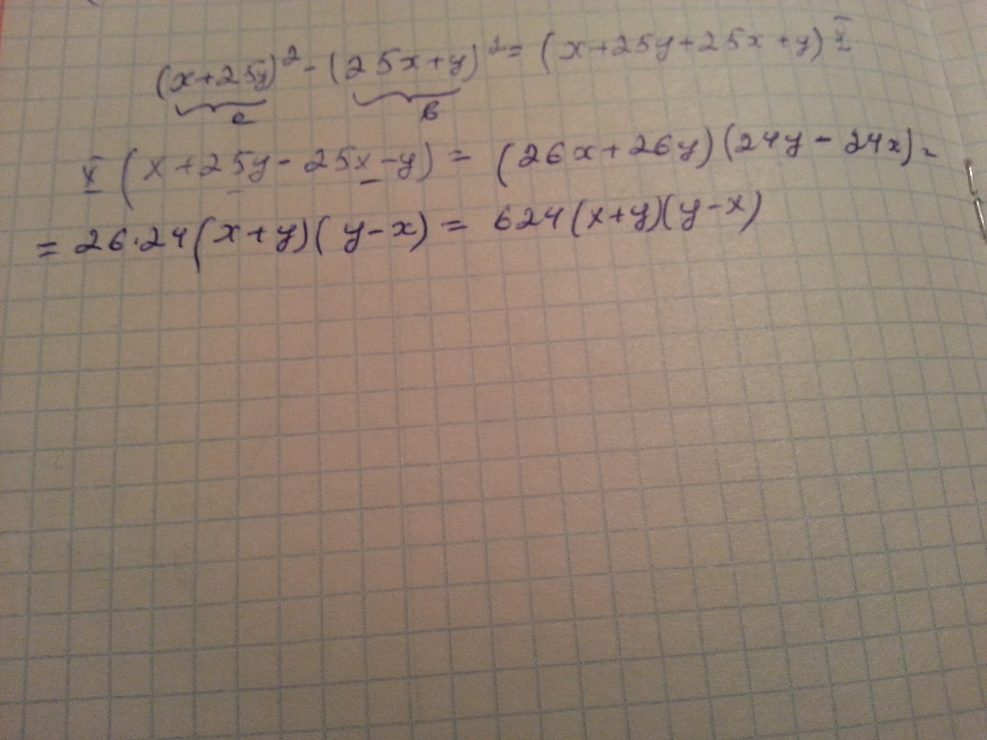 (x+25y)²-(25x+y)²=x²+50xy+625y²-(625x²+50xy+y²)=x²+50xy+625y²-625x²-50xy-y²=x²+625y²-625x²-y²=x²(1-625)-y²(1-625)=x²(-624)-y²(-624)=-624(x²-y²)=-624*(x-y)*(x+y)