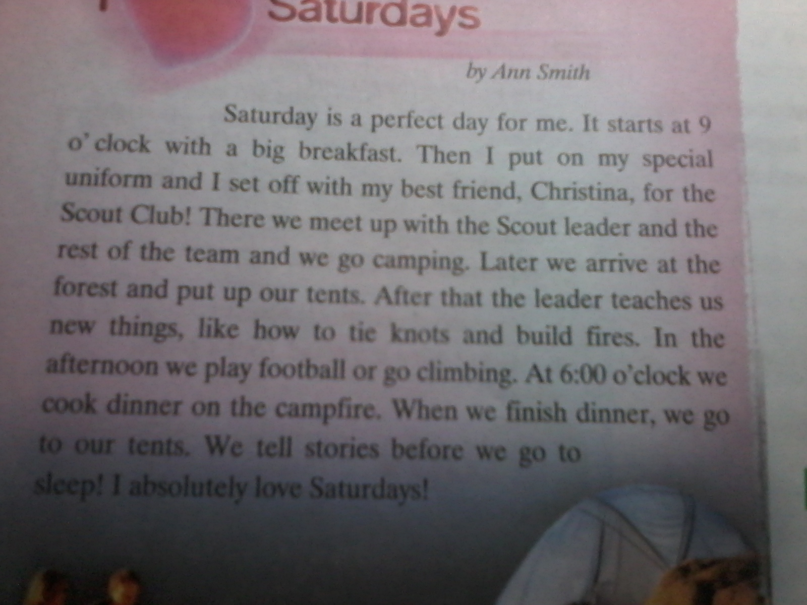 Суббота является идеальным днём для меня. Она начинается в 9 часов с большим завтраком. Потом я надеваю свою специальную форму и я иду с моим лучшим другом, Кристина, для клуба скаутов! Там мы встречаемся с лидерами скаутов и остальными частью команды, и мы идем в поход. Позже мы идём в лес и ставим наши палатки. После этого лидер учит нас новым вещам , как связать узлы и делать костры . После полудня мы играем в футбол или занимаемся скалолазанием. В 6:00 мы готовим ужин на костре. Когда мы закончим ужинать, мы идем к нашим палаткам. Мы рассказываем истории, прежде чем идти спать. Я абсолютно люблю Субботы!