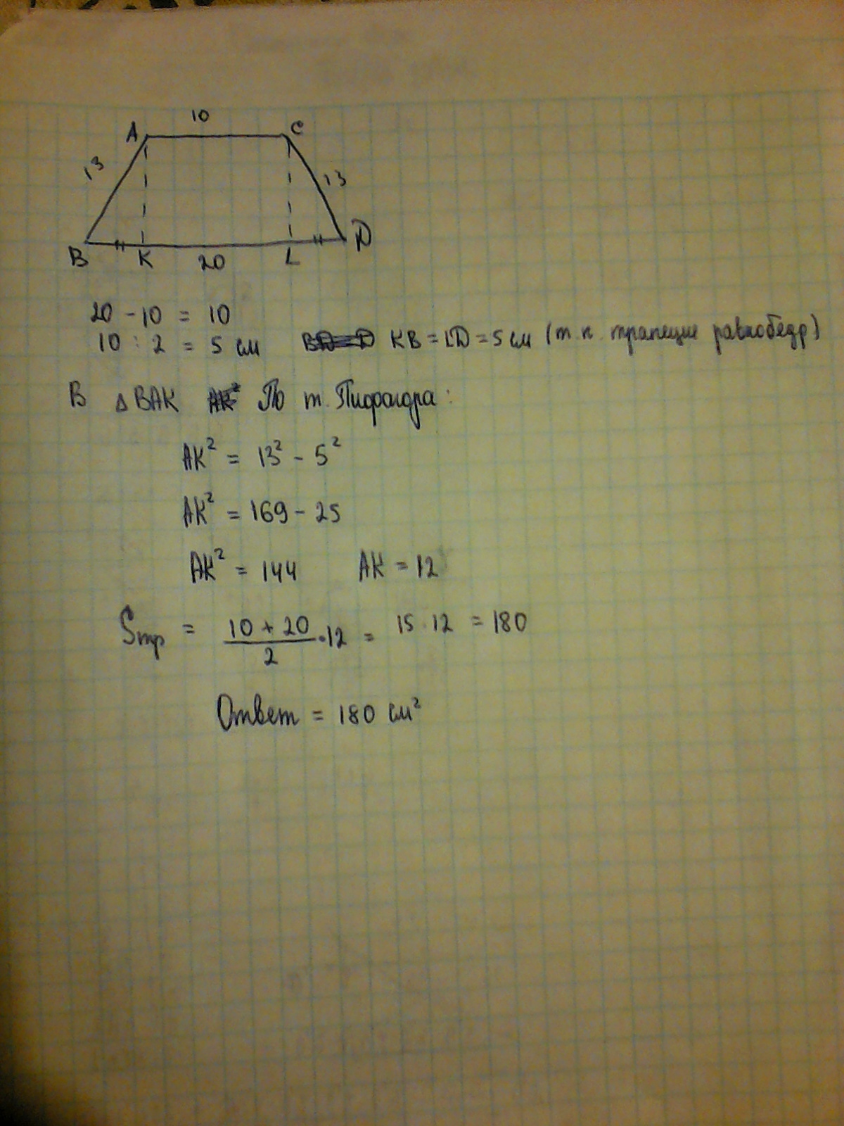 Основания равнобедренной трапеции равны 10 см и 20 см, а боковая сторона равна 13 см. Найдите площадь трапеции.