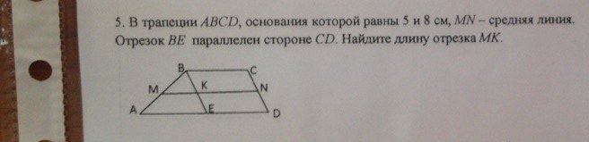 MN - средняя линия = (ВС+АД)/2 =(5+8)/2=6,5