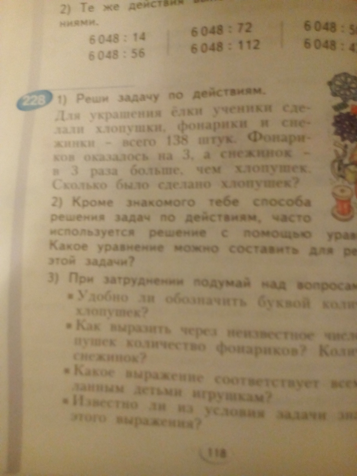 как решить задачю 4класса : Для украшения ёлки ученики сделали фанарики , снежинки и хлопушки , всего 138 штук . фонариков на 3 больше , а снежинок в 3 раза больше , чем хлопушек . Сколько было хлопушек.
