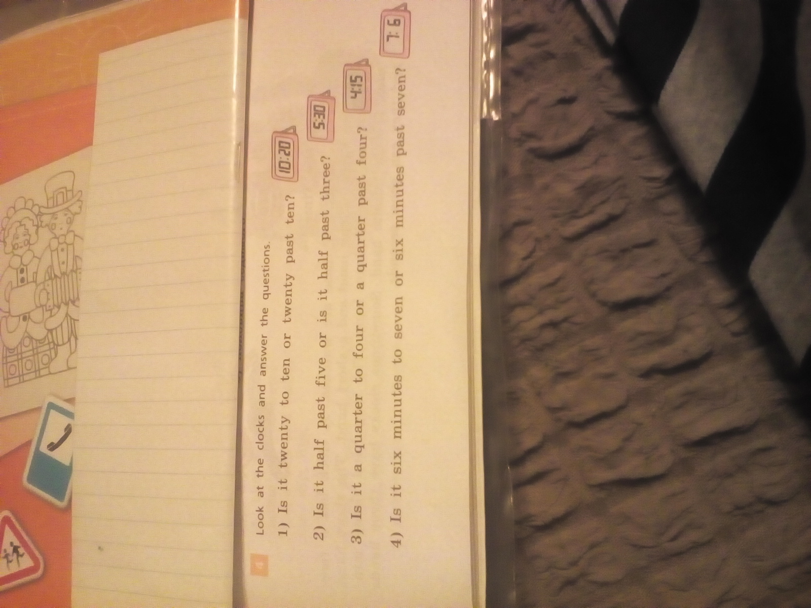 Перевод: Посмотри на часы и ответь на вопросы.