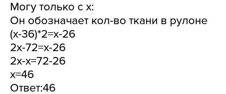 В двух рулонах было одинаковое количество ткани. Когда от первого рулона отрезали 36 м, а от второго 26м, то в первом рулоне осталось в 2 раза меньше, чем во втором Сколько метров ткани было в каждом рулоне?