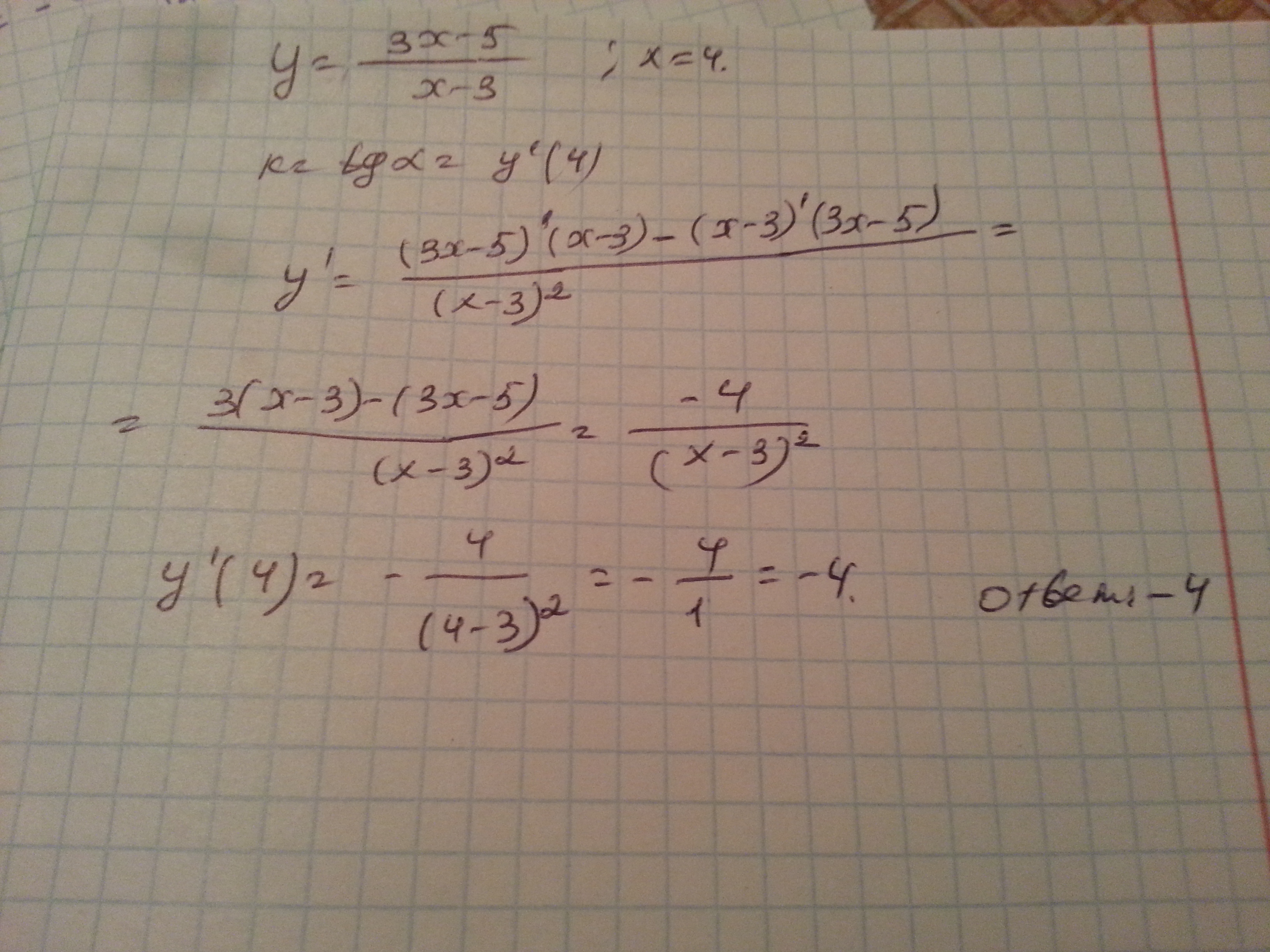 k=y'(4)=-4/(4-3)²=-4. Ответ: k=-4.