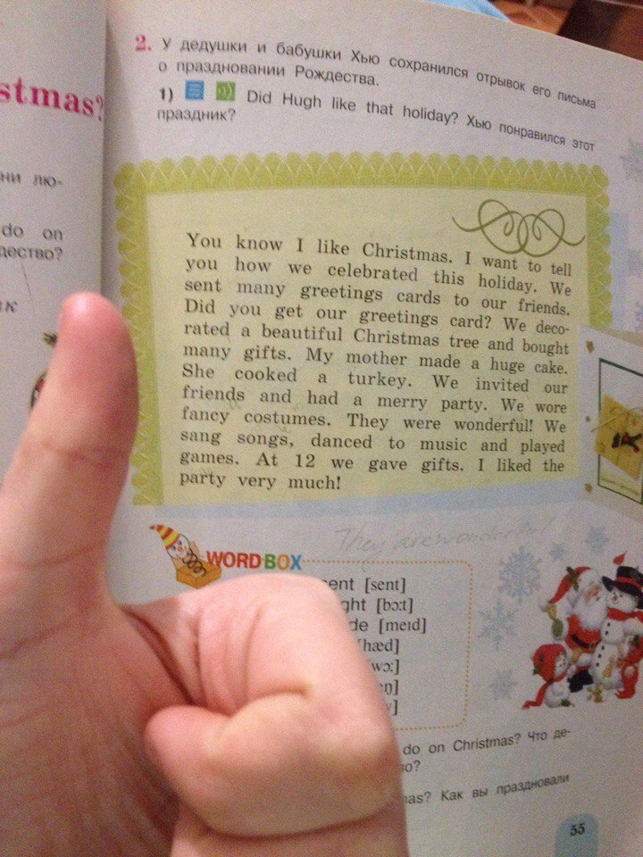 You know I like Christmas. I want to tell you how we celebrate this holiday. We send many greeting cards to our friends. Do you get our greeting card? We decorate a beautiful Christmas tree and buy many gifts. My mother makes a huge cake. She cooks a turkey. We invite our friends and have a merry party. We wear fancy costumes. They are wonderful! We sing songs, dance to the music and play games. At 12 we give gifts. I like the party very much! Вы знаете, что я люблю Рождество. Я хочу рассказать вам, как мы празднуем его. Мы посылаем много поздравительных открыток нашим друзьям. Вы получаете нашу поздравительную открытку? Мы наряжаем красивую елку и покупаем много подарков. Моя мама делает огромный пирог. Она готовит индейку. Мы приглашаем наших друзей на веселую вечеринку. Мы надеваем фантастические костюмы. Они чудесные! В 12 часов мы дарим подарки. Я очень люблю эту вечеринку!