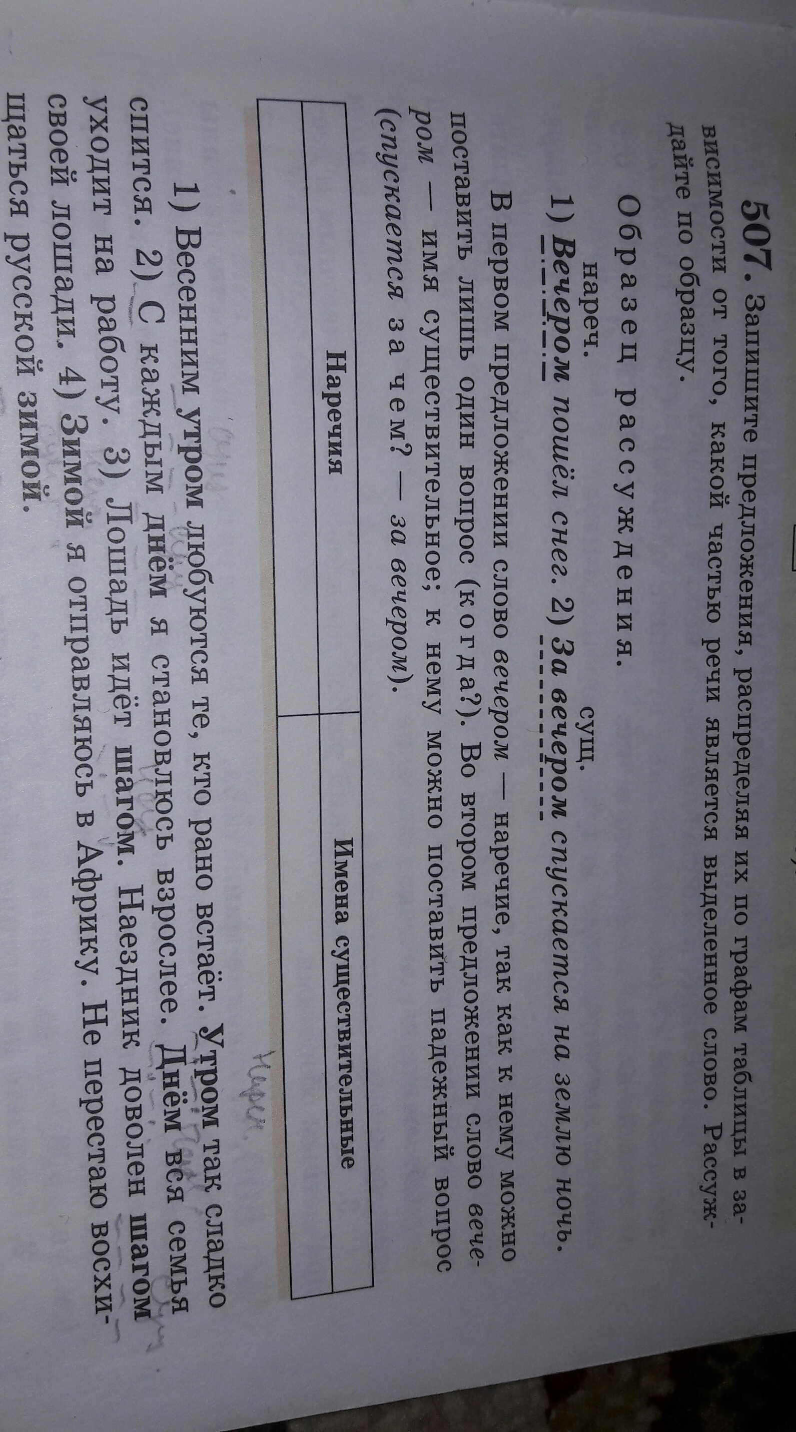 Запишите предложения, распределяя их по графам таблицы в зависимости от того, какой частью речи является выделенное слово . Рассуждайте по образцу