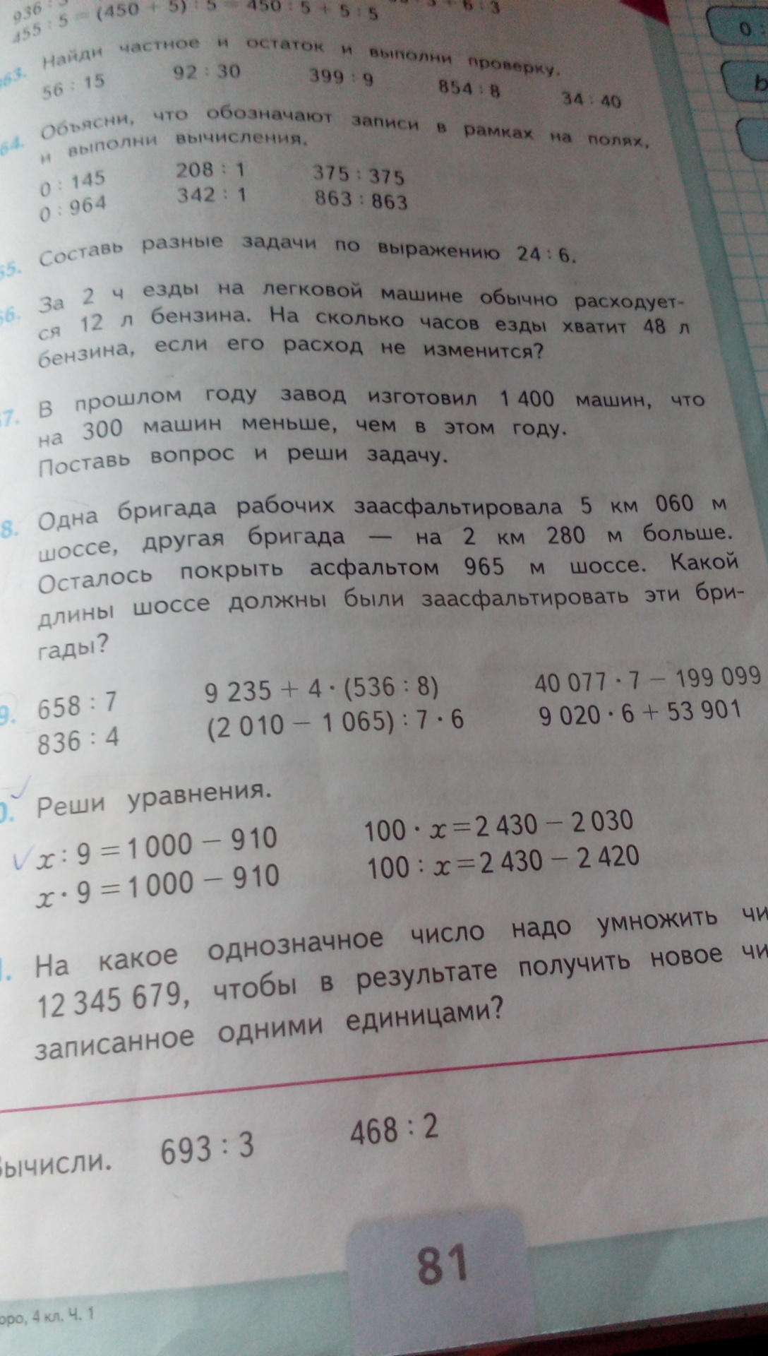Одна бригада рабочих заасфальтировала 5 км 60 метров шоссе другая Бригада на 2 километра 280 метров больше осталось покрыть асфальтом 965м шоссе Какой длины должны были заасфальтировать эти бригады?номер 368
