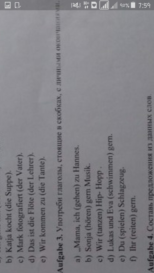 A gehe b hört c tanzen d schwimmen e spielst f reitet