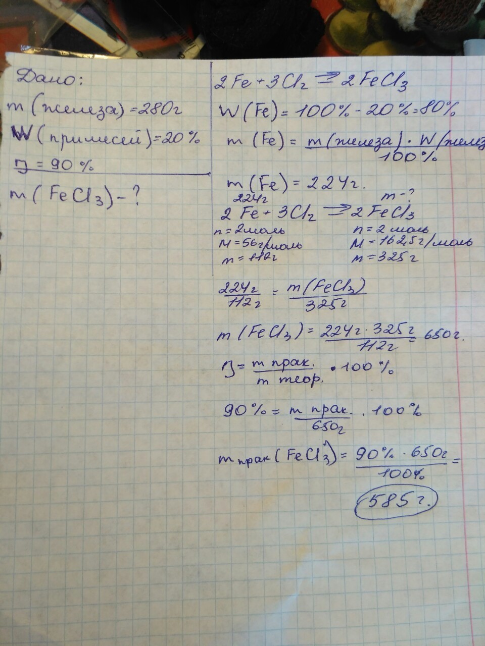Сколько г хлорида железа (III) получится при взаимодействии 280 г железа, содержащего 20% примесей, с хлором, если выход продукта реакции составляет 90% от теоретически возможного?
