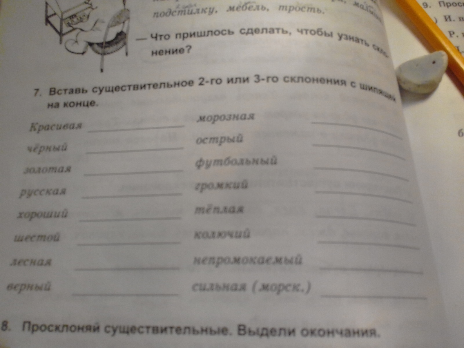 ты должен вставить какое нибудь слово ж.рода или мужского(среднего) с щипящими на конце( щ, ш, и т.д. ) например, русская печь(3 скл. на конце ь)