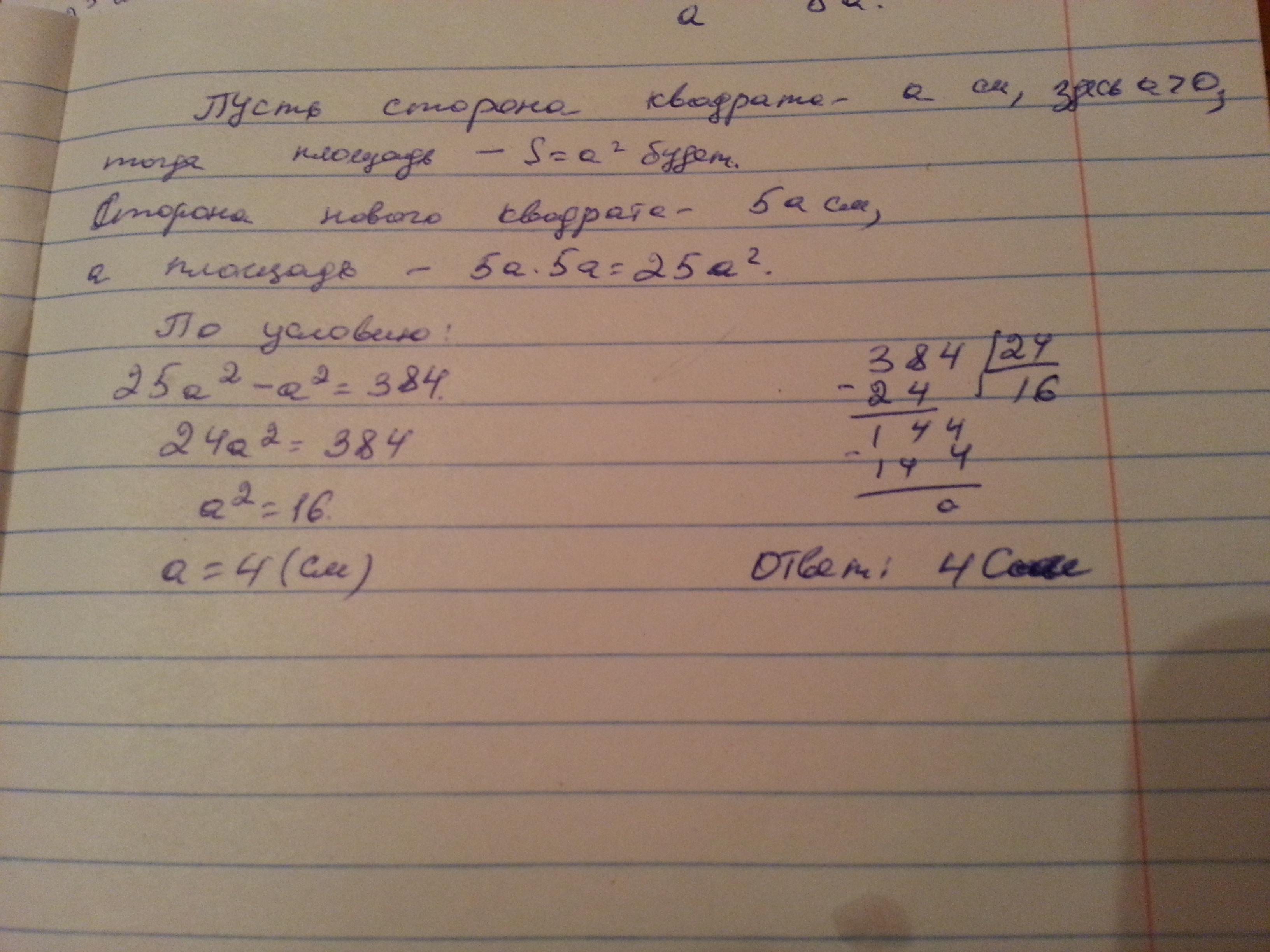 сторону квадрата увеличили в 5 раз и получили новый квадрат площадь которого на 384 сантиметров квадратных больше площади данного квадрата Найдите сторону данного квадрата