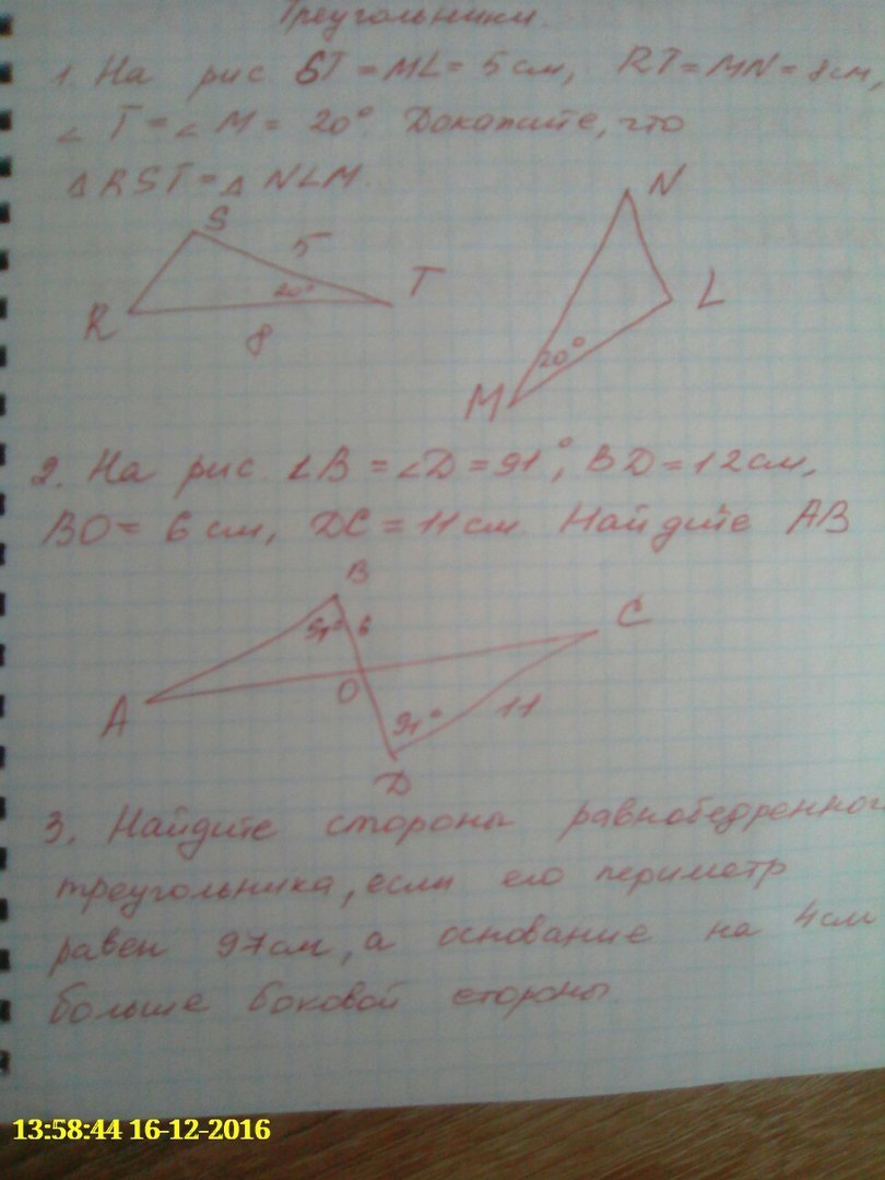 1.На рисунке БТ = МL = 5см, VN = 1см, угол Т = углу М = 20градусов. Докажите, что треугольник RST равен треугольнику NLM.