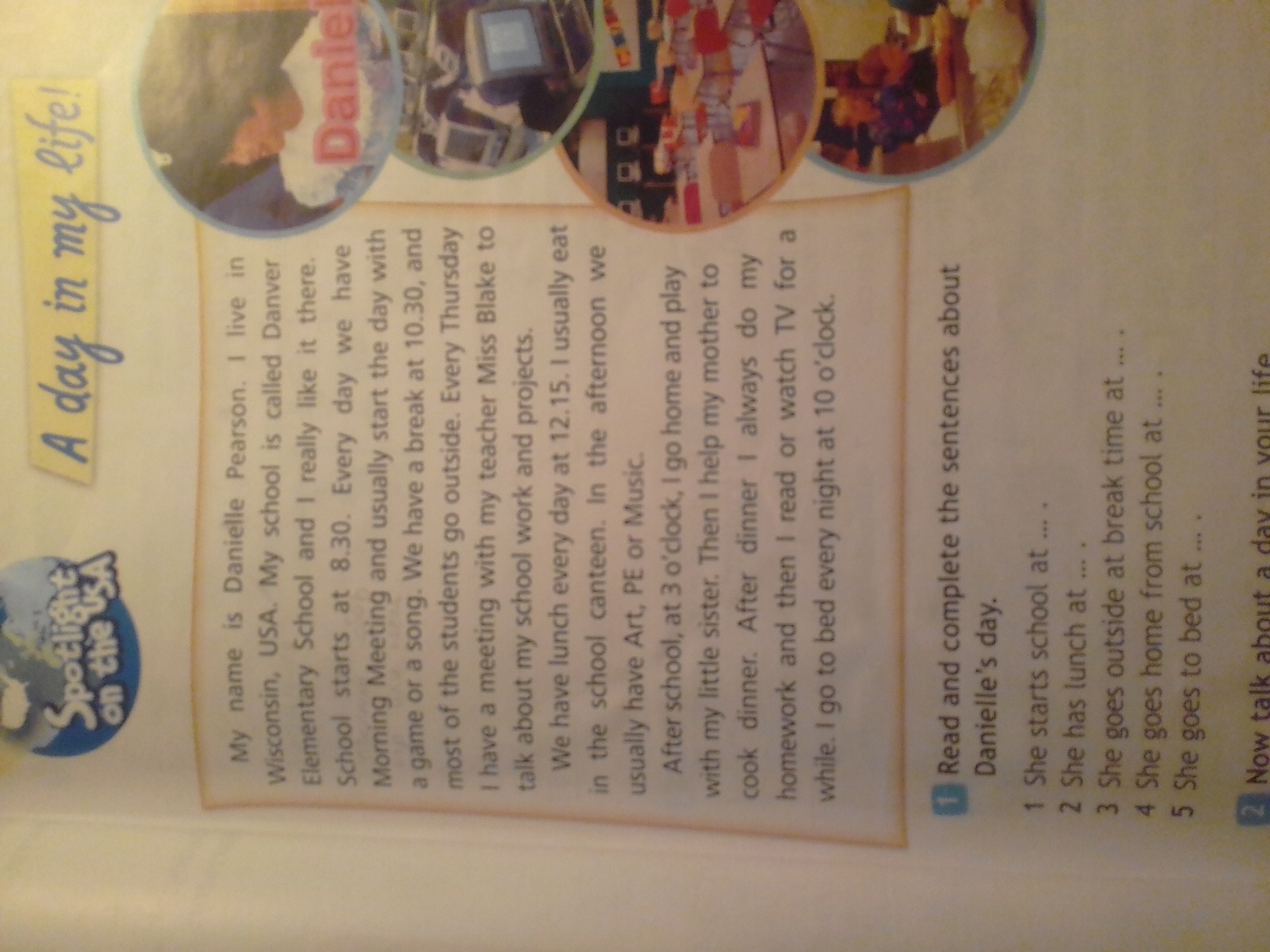 Меня зовут Даниель Пеарсон.Я живу в Винконсине в США. Я учусь в Денвильской начальной школе и она мне наравится. Школа начинается с 8:30.Каждый день мы делаем зарядку и {начинаем день с игры в песню}.Мы завтракаем в 10:30, большенство студентов снаружи(едят). Каждый четверг я провожу зарядку с моей учительницой мисис Блек и мы говоримо моей школе и {проектах}.