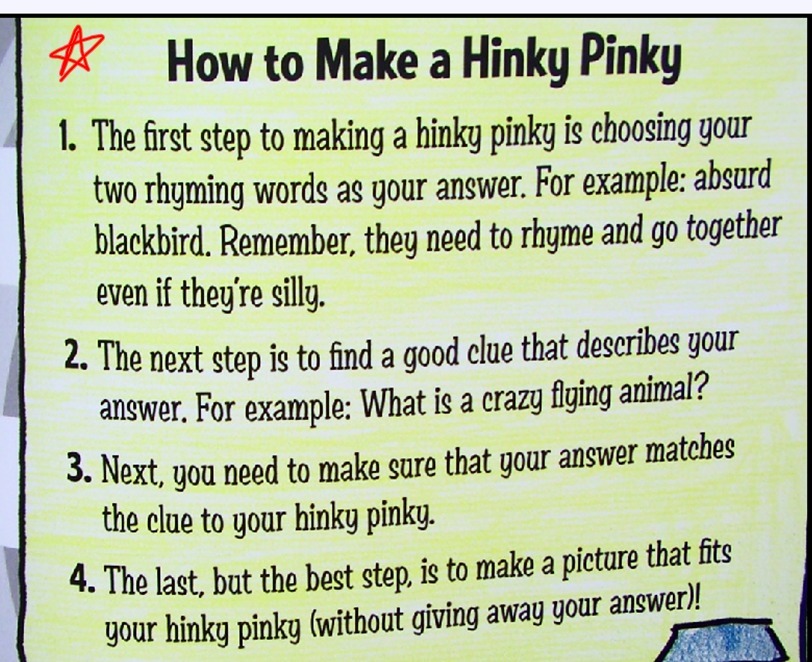 A Hinky Pinky is a funny riddle. The answer is always a rhyming pair of words that match a silly definition.