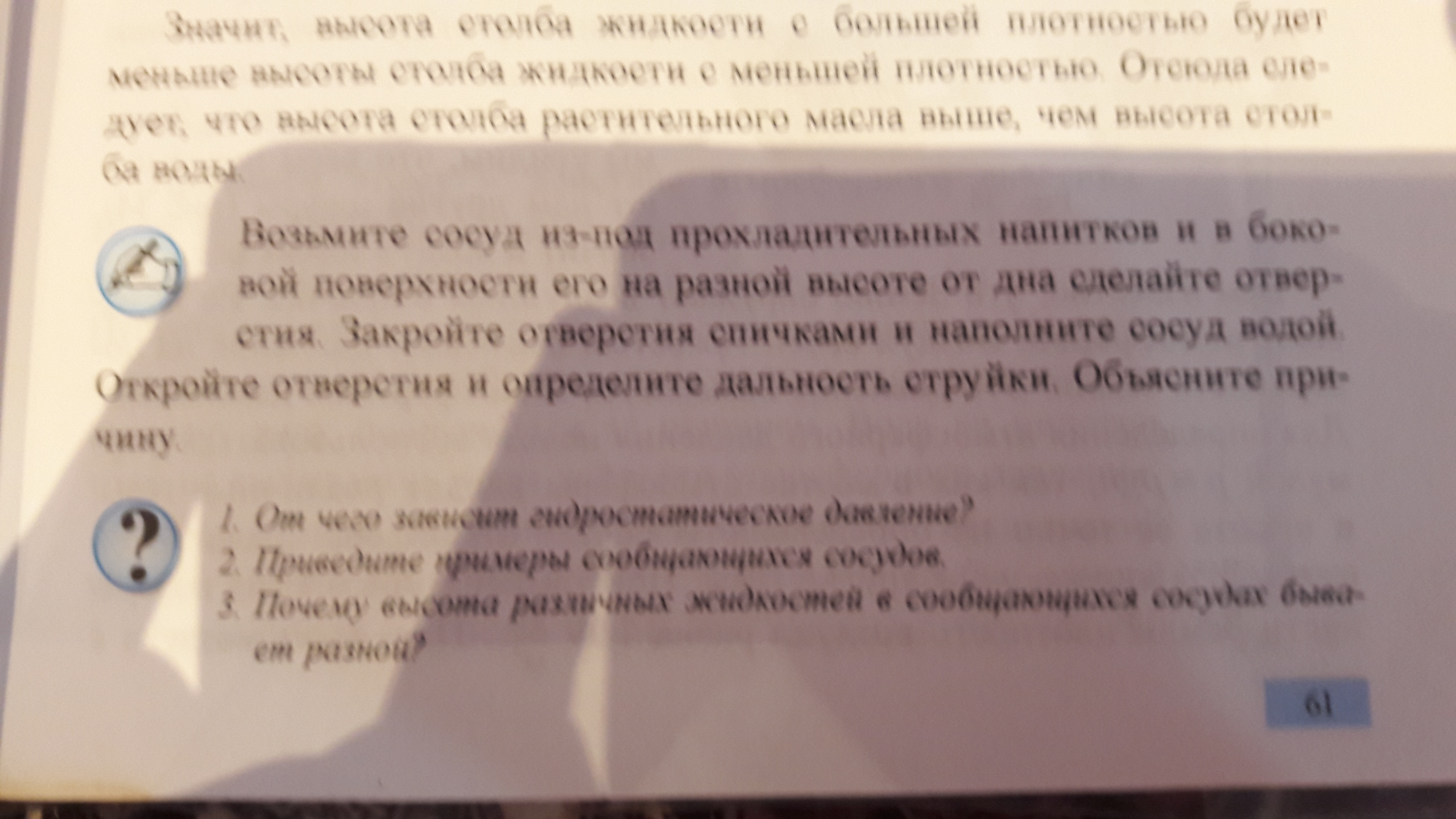 1.Гидростатическое давление на глубине зависит от плотности жидкости и высоты столба жидкости. 2.Шлюзовые камеры на каналах, разного рода доки на судоремонтных предприятиях, гидравлические домкраты, чернильницы-непроливашки (если они еще существуют в природе) , некоторые картриджи струйных принтеров, водонапорные башни вместе с системой водопровода, системы подачи водяного отопления и т. д. и т. п.