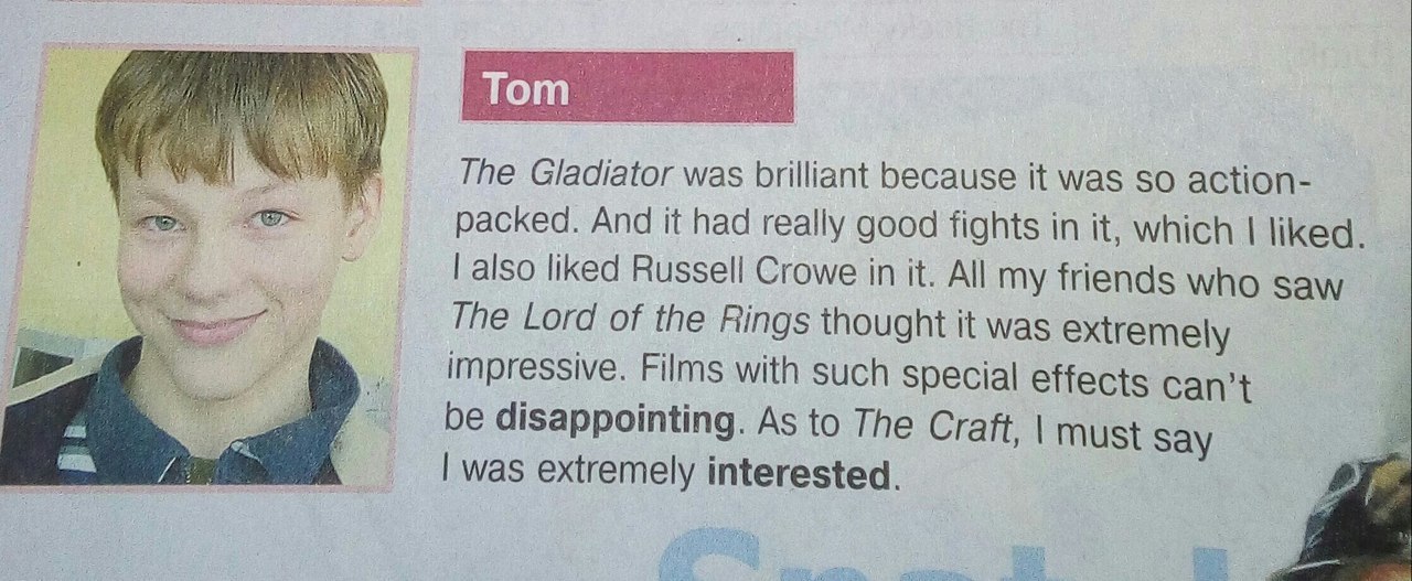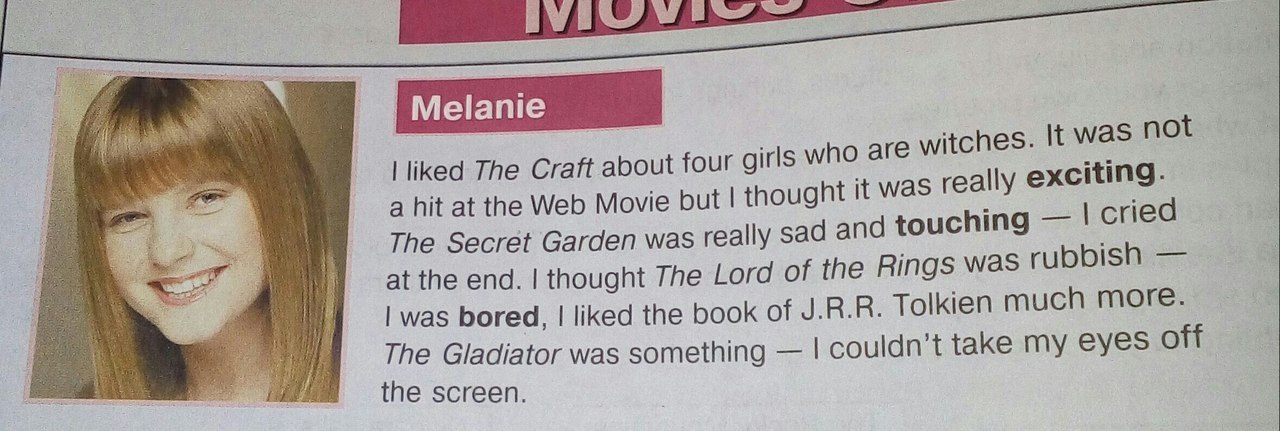 Мне понравился фильм "The Craft", который был о четырёх девочках-ведьмах. В рейтинге фильмов на Web Movie он не был самым популярным, но я подумала, что он может быть классным. "The Secret Garden" был настолько печальным и трогательным, что я заплакала в конце. Как мне показалось, фильм "The Lord of the Rings" - это та ещё скучная бредятина, а вот одноименная книга Толкиена мне намного больше понравилась. "The Gladiator" - это было что-то: я просто не могла оторвать глаз от экрана.