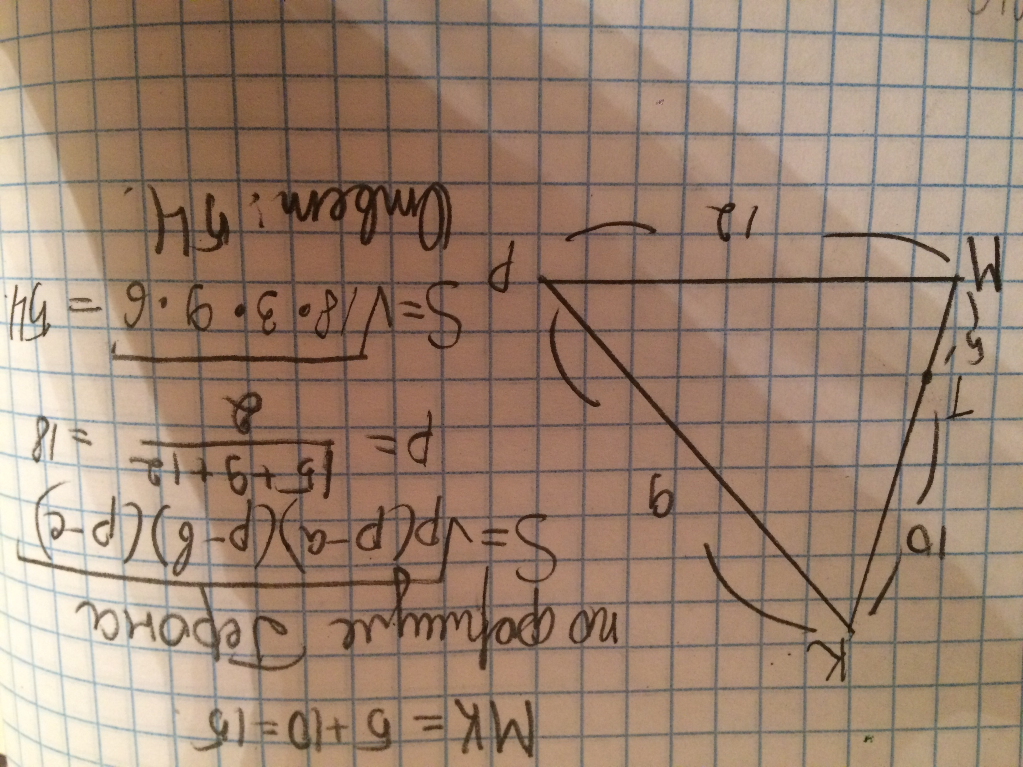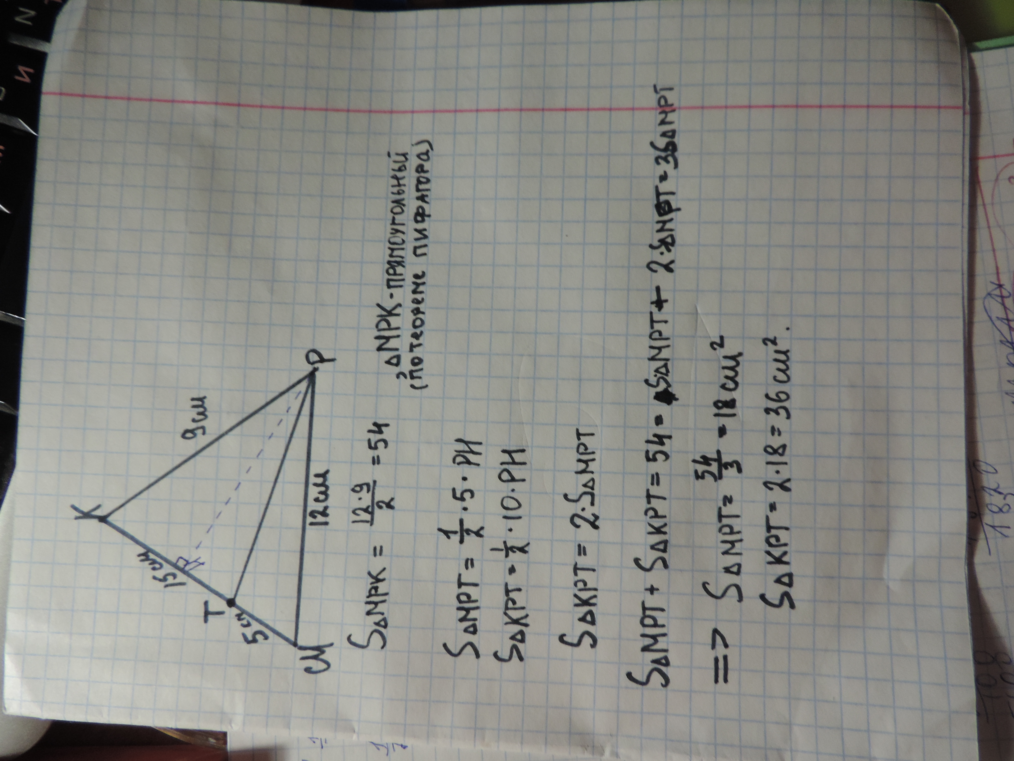 .Дан треугольник МКР. На стороне МК отмечена точка Т так, что МТ = 5 см, КТ =10 см. Найдите площади треугольников МРТ и КРТ, если МР = 12 см, КР = 9 см.