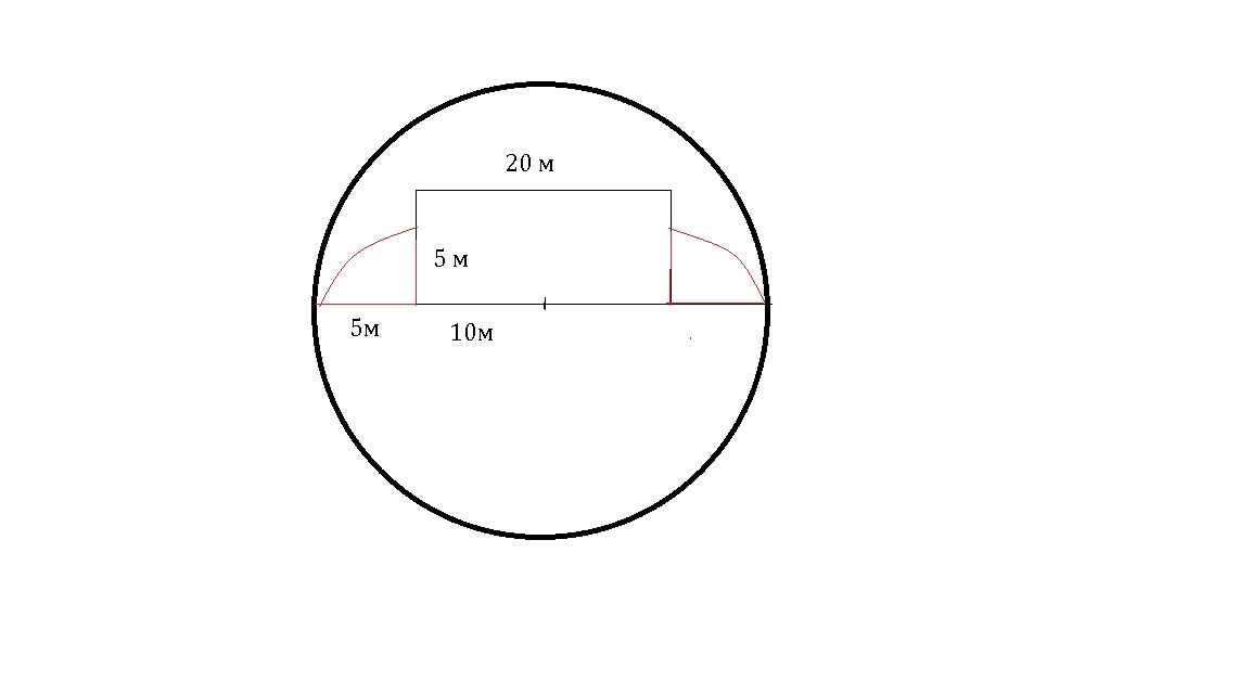 Также газонокосилка описывает по углам дома четверть окружности: 10 м по стене длинной 20 м, тк розетка посередине, и 15-10=5 м по стене длинной 10 м. Значит радиус 5 метров.