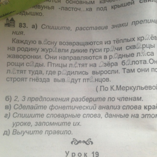 Каждую весну возвращаются из тёплых краёв на родину журавли,дикие гуси,грачи,скворцы,жаворонки.Они(подлежающие) направляются(сказуемое) в родные(определение) леса(обстоятельство),рощи(обстоятельство),сады(обстоятельство).Птицы(подлежающее) летят(сказуемое) на озёра(дополнение),болота(дополнение).Они летят туда,где родились,выросли.Там они построят гнёзда,выведут птенцов.