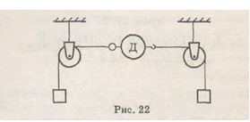 4) На рисунке 22 изображены два груза, висящие на концах перекинутых через блоки нитей. Другие концы нитей привязаны к динамометру Д. Какую силу показывает динамометр, если вес каждого из грузов равен 7 Н?