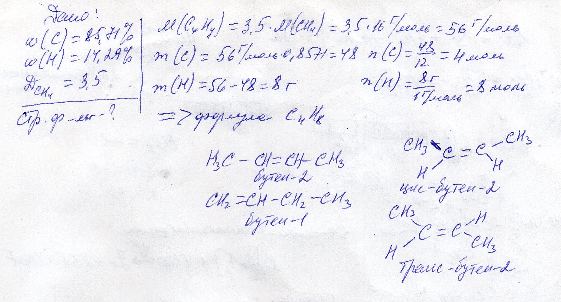 Выведите молекулярную формулу углеводорода, в котором массовая доля углерода составляет 85, 71 %. Углеводород в 3,5 раза тяжелее метана. Составьте структурные формулы его изомеров и дайте им названия. При наличии цис-транс-изомерии составьте формлы соответсвующих цис- и транс-изомеров.