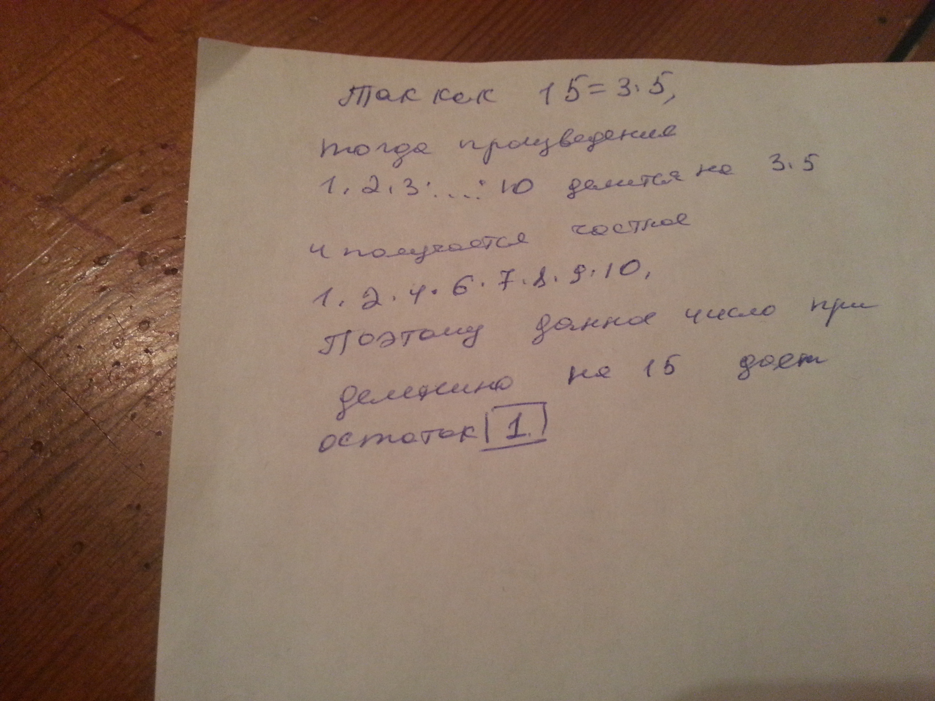 Найдите остаток от деления числа 1×2×3×4×5×6×7×8×9×10+1 на 15.