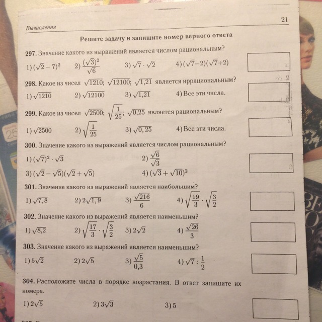 299. Корень из 2500 - 50. Корень из 1/25 - 1/5. Корень из 0.25 - 0,5.
