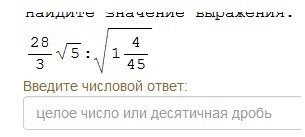 Нужно все занести под один корень, при этом перевести дробь 1 целая 4/5 в неправильную дробь и перевернув её, тогда в числителе получается произведение чисел (28•28•5•45)/(3•3•49)=под корнем 400= 20