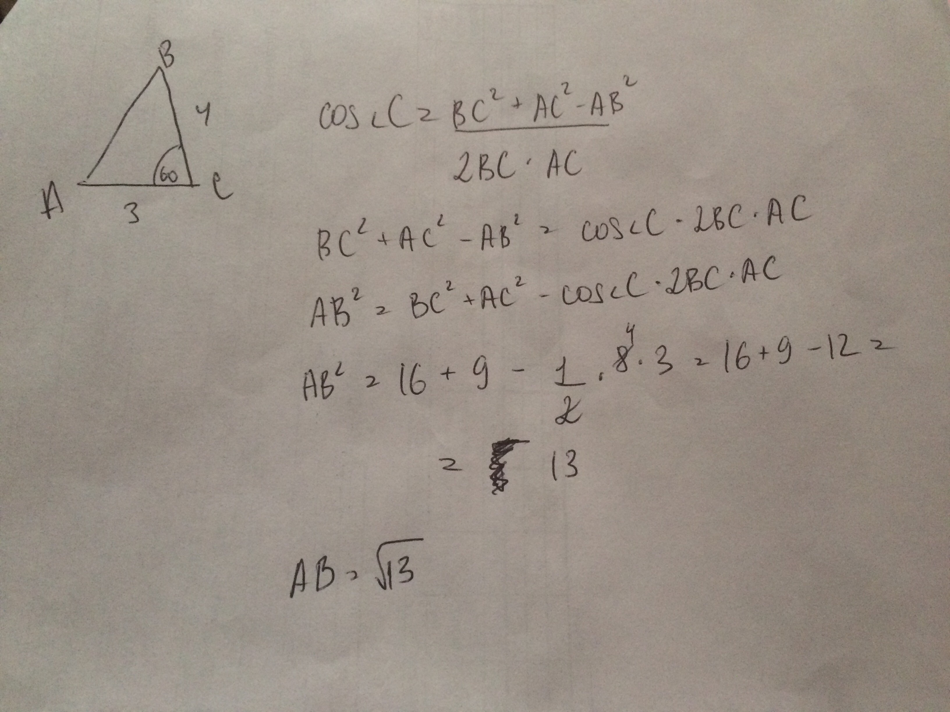 АВ, если АС=3см, ВС=4см и ∠С=60градусов.