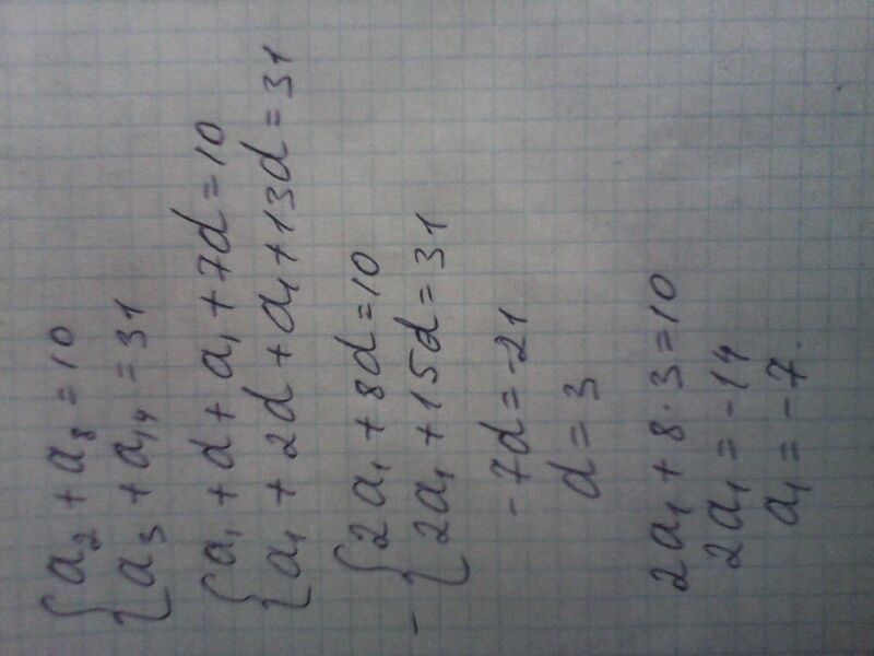 Егор арифметикалық прогрессияның екінші және сегізінші мүшелерінің қосындысы 10-ға, ал ушінші жане он тортинши мушелеринин қосындысы 31-ге тен болса, онда биринши мушесин аныктандар .