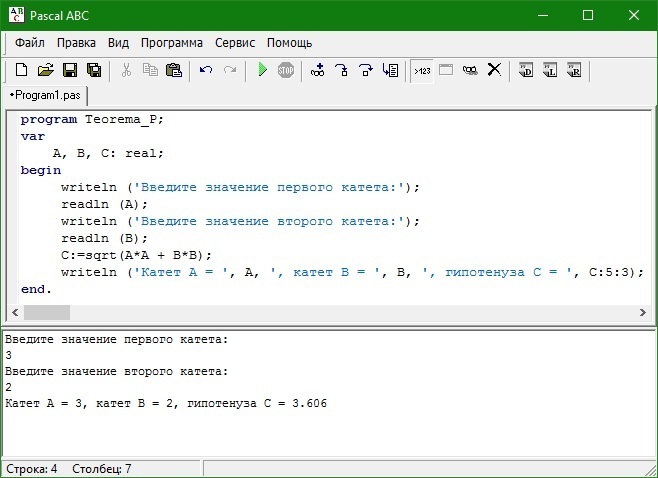 writeln ('Катет А = ', A, ', катет В = ', B, ', гипотенуза С = ', C:5:3);
