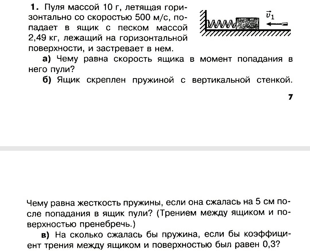 Сначала закон сохранения импульса: Импульс ящика с застрявшей пулей такой же как импульс самой пули