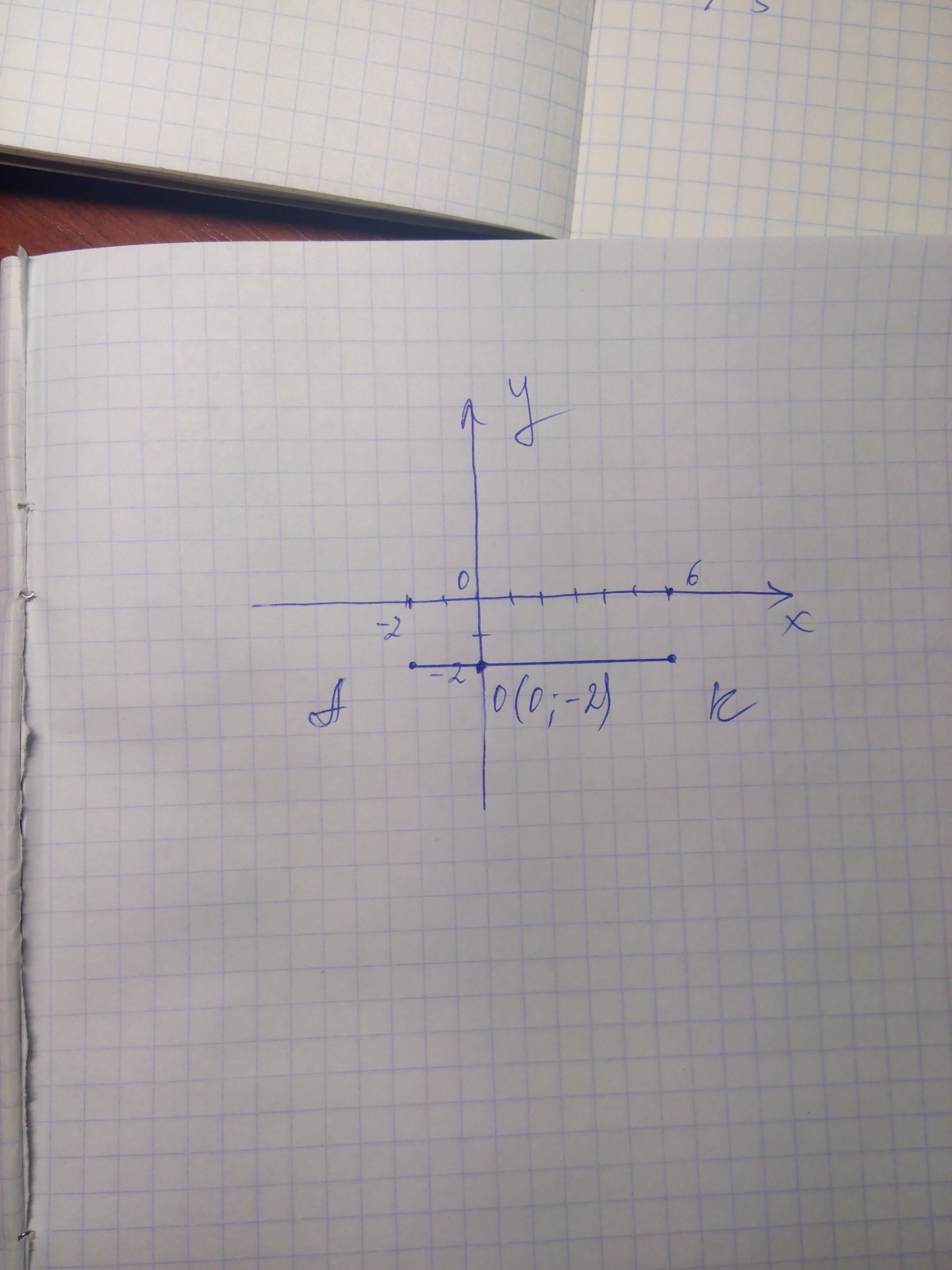 A (-2; -2), K (6; -2) постройте отрезок AK и найдите точки пересечения с осями (Если можно, вставьте фото)