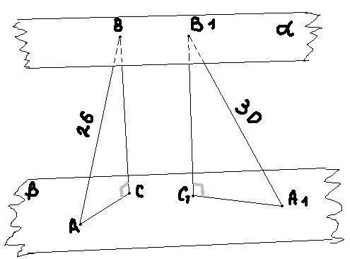 пусть отрезки АВ и СД касаются плоскостей в точках А, В, С, Д. АВ=30 см, СД=26 см