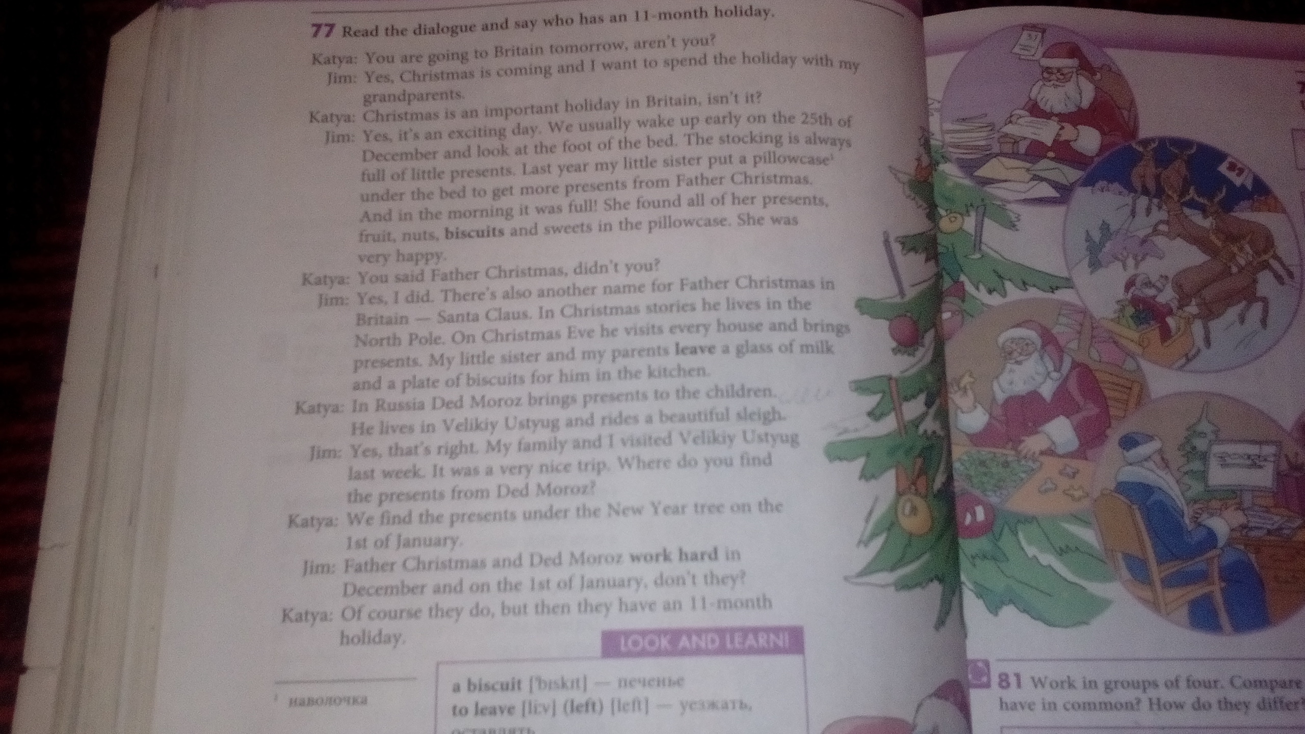Джим: Да, сказал. В Британии есть и другое прозвище Деда Мороза - Санта Клаус. В Рождественских историях он живёт на Северном Полюсе. В канун Рождества он посещает каждый дом и оставляет там подарки. Моя младшая сестра и мои родители оставляют для него стакан молока и тарелку печенья на кухне.