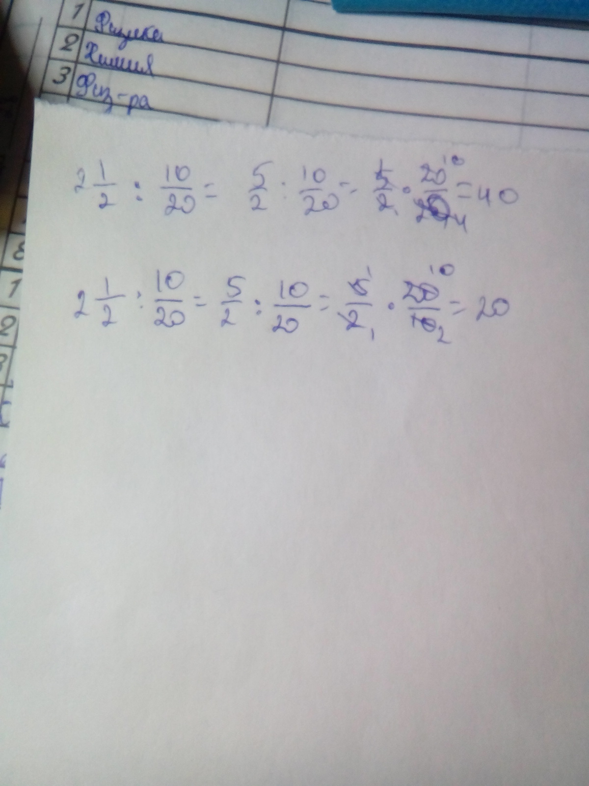 Две целых одна вторая разделить в отношении десять разделить на двадцать