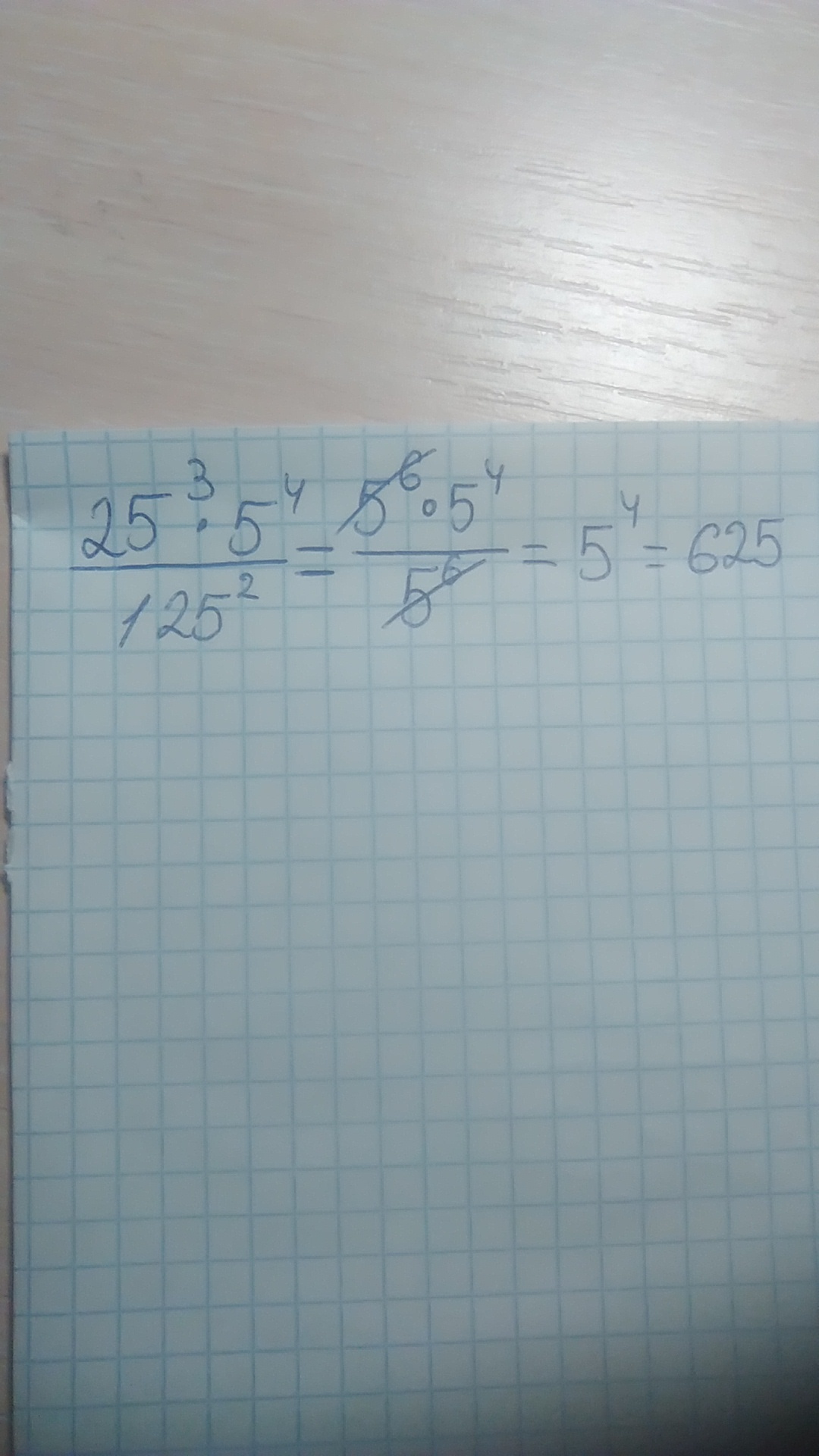 125 сокращаешь с 25 получишь в числители и знаменатили 5, а степень это надо умножить 3×2 получишь 6. Следущие 5 в четвертой степени так и переносишь. Потом сокращаешь 5^6 с 5^6 получется ноль. Осталось 5^4 , чтоб получить 625, ты должен перемножить пятерку на четыре раза .