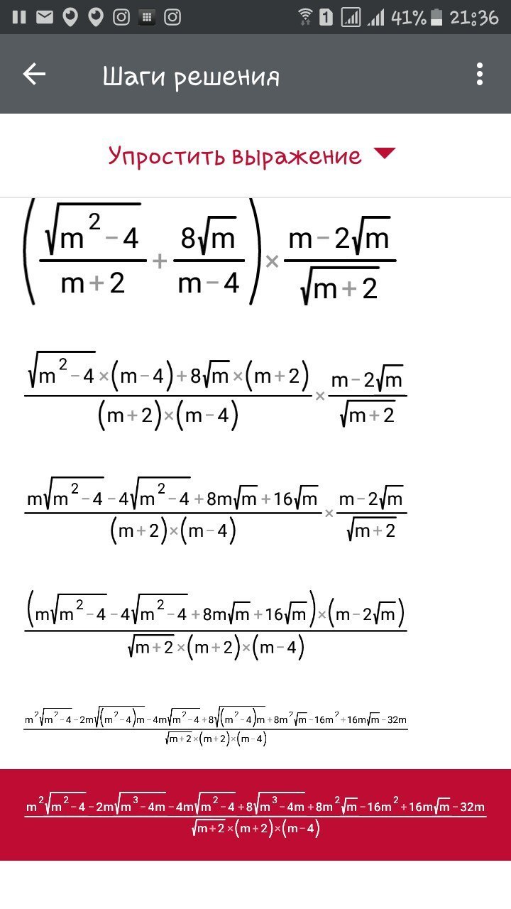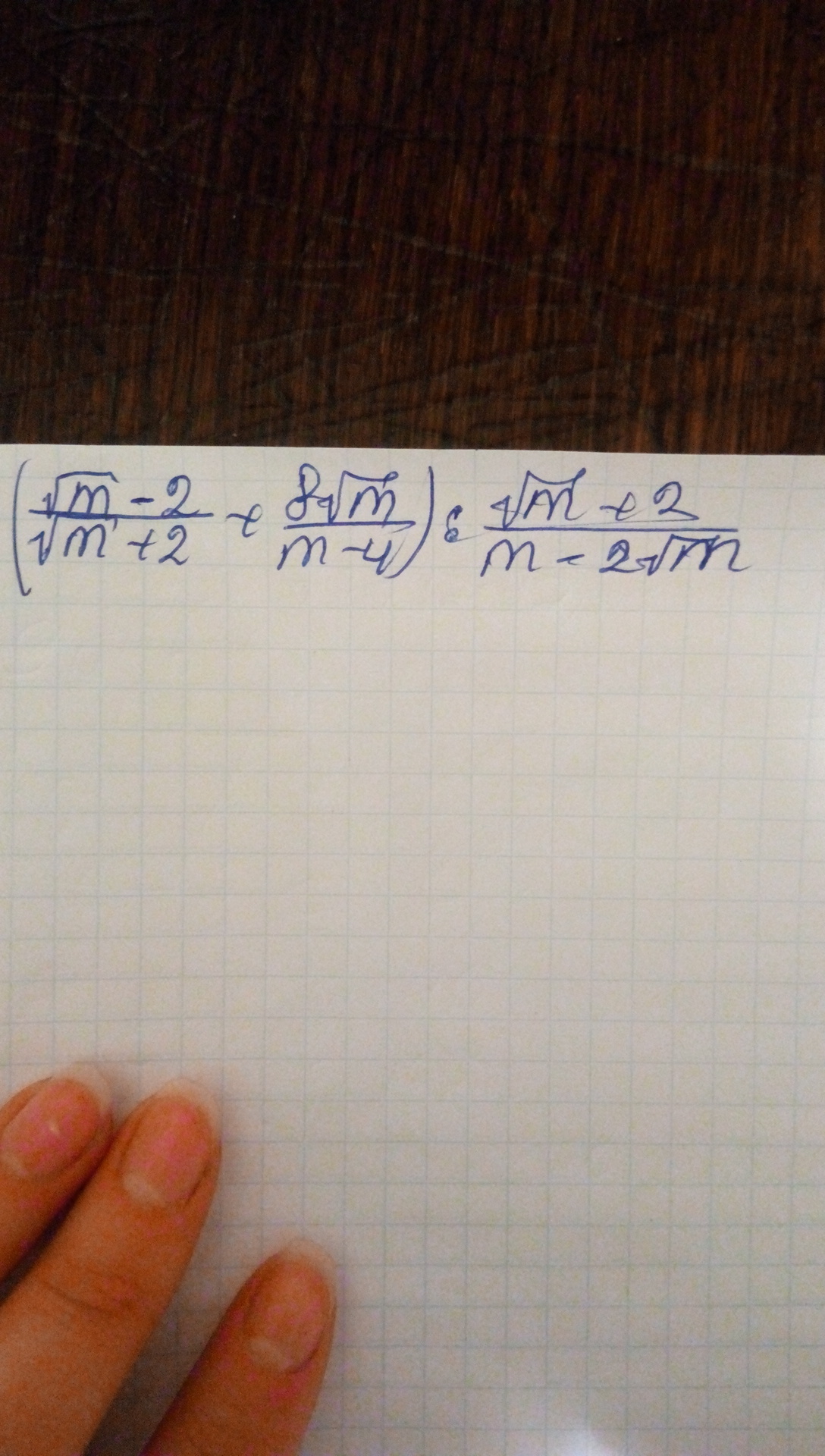 ((м^1/2-2)/(м^1/2+2)+8(м^1/2)/(м-4)):(м^1/2+2)/(м-2*м^1/2)= ((м^1/2-2)/(м^1/2+2)+(8*м^1/2)/(м^1/2-2)(м^1/2+2))*(м^1/2(м^1/2-2))/(м^1/2+2)= (((м^1/2-2)(м^1/2-2)+8*м^1/2)/(м^1/2-2)(м^1/2+2)*(м^1/2(м^1/2-2))/(м^1/2+2)= ((м-2*2*м^1/2+4+8*м^1/2)*м^1/2)/(м^1/2+2)^2= ((м+2*2*м^1/2+4)*м^1/2)/(м^1/2+2)^2= ((м^1/2+2)^2*м^1/2)/(м^1/2+2)^2= м^1/2.